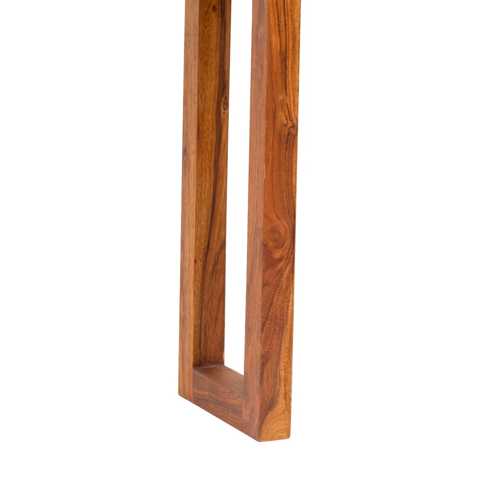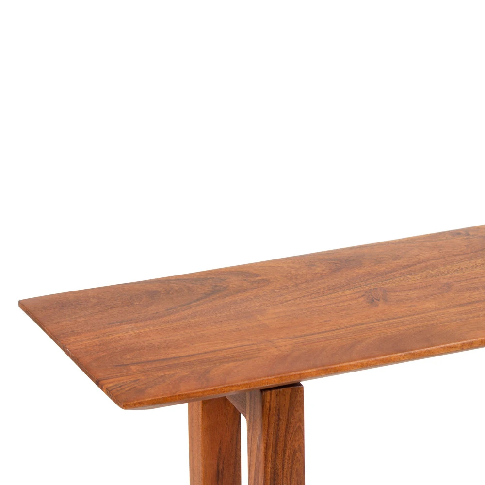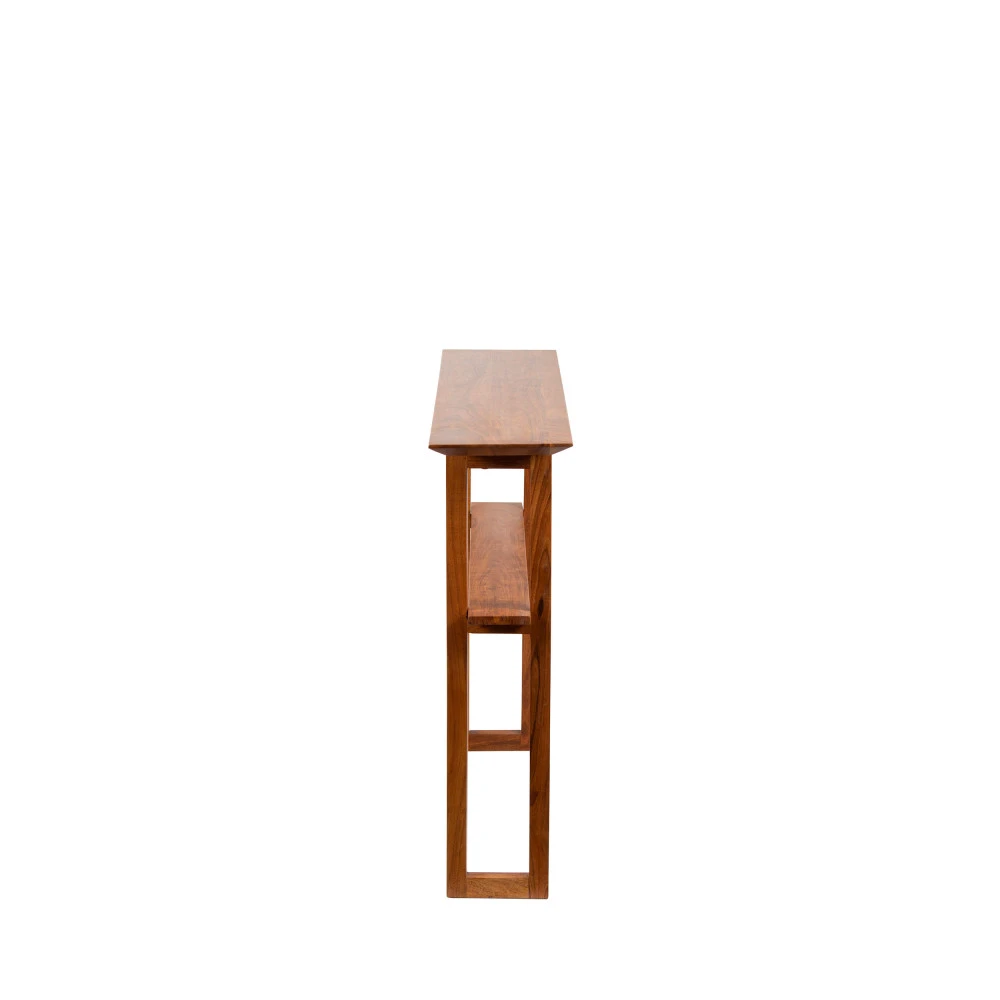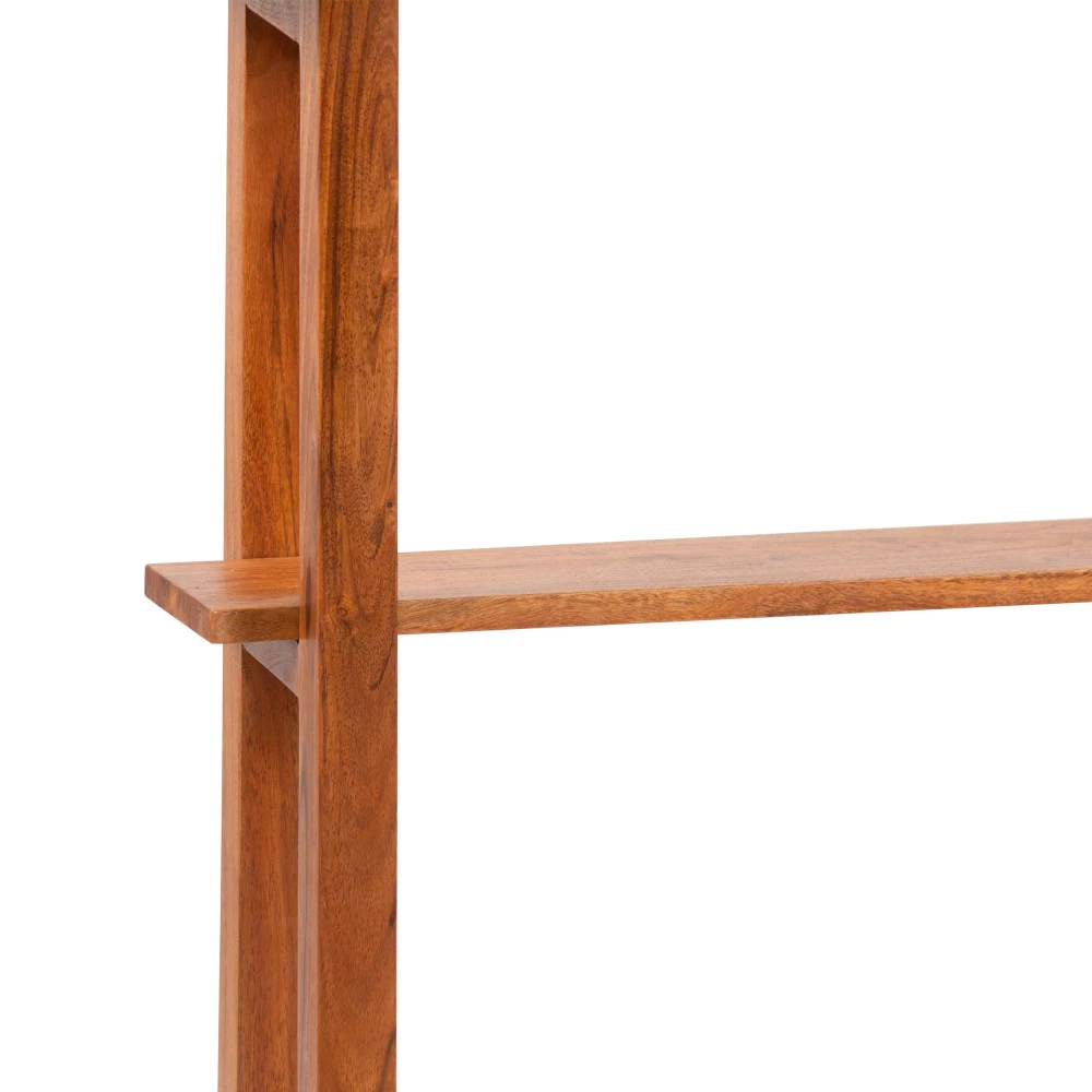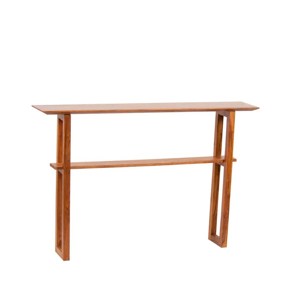 La console A-Side a des dimensions idéales pour les pièces étroites, avec ses deux plateaux de 25 cm de profondeur. Elle offre des finitions biseautées sur le plateau supérieur. Le bois d’acacia des plateaux n’est pas traité, il est donc recommandé de faire attention aux objets pointus, à l’humidité et à la lumière directe du soleil. Pour protéger les sols en bois, placez des patins en feutre sous le piètement.