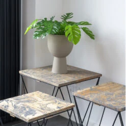 Amalfi mesure 27 x 19 cm et affiche une forme géométrique intéressante. Il se compose d’une première partie avec base arrondie puis d’un socle conique. Conçu en métal, ce cache-pot robuste traversera bien plus volontiers le temps qu’une jardinière classique en plastique.