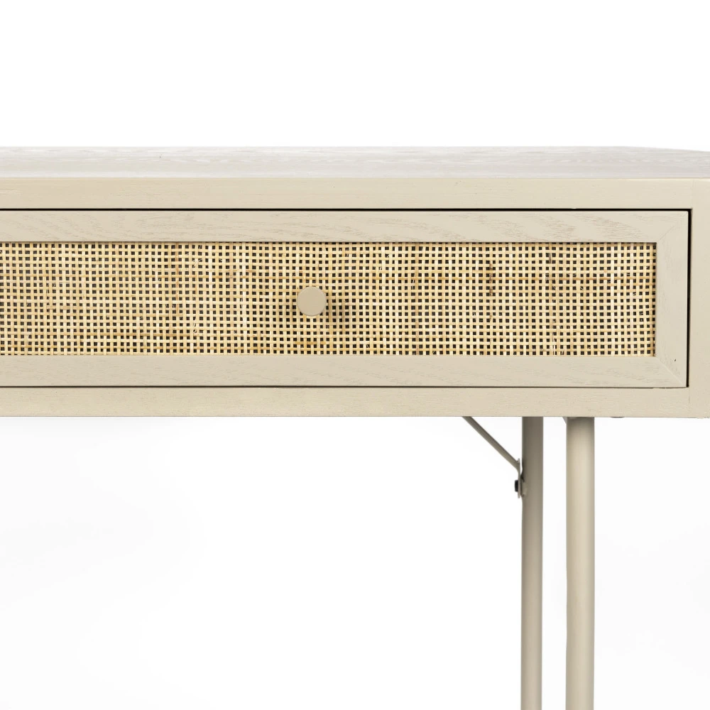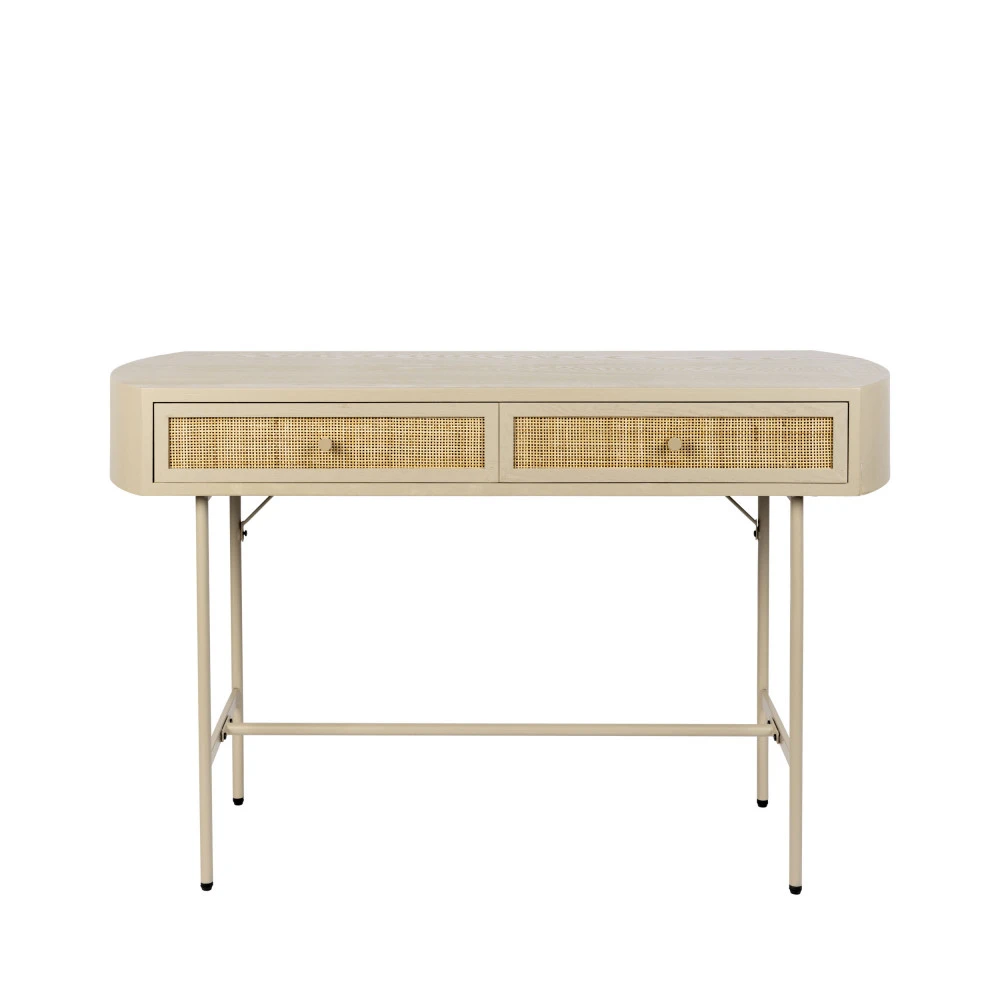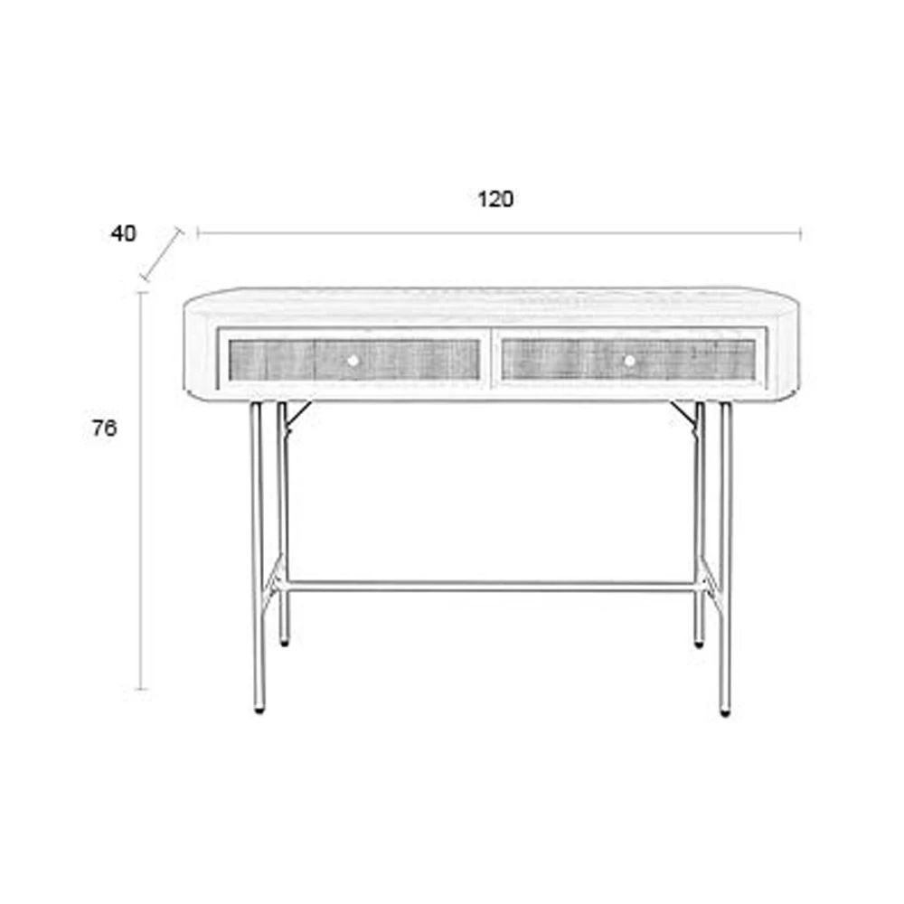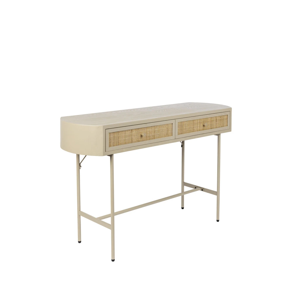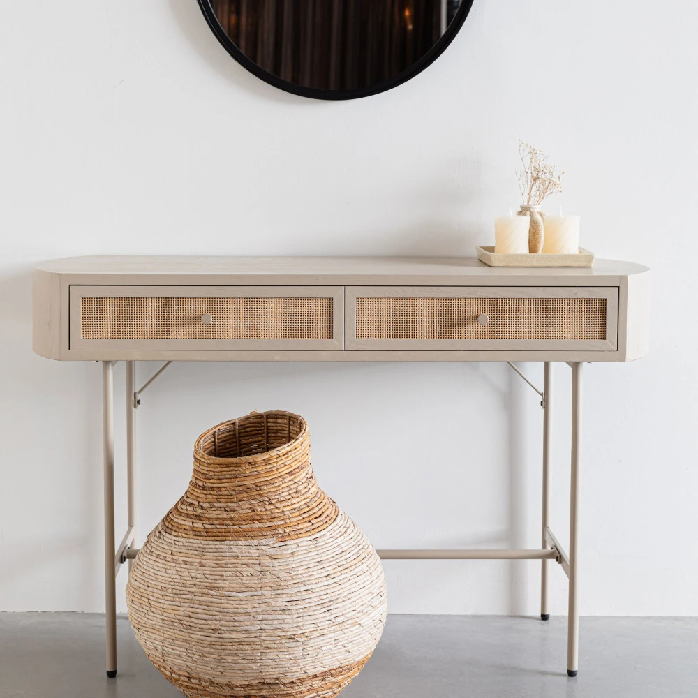 Et côté matériaux ? Cette console est conçue en MDF, et se pare de rotin sur la façade des tiroirs, pour un style bohème et élégant, avec une touche de modernité grâce au piètement en acier. Les pieds fins permettent également de ne pas alourdir l’ensemble.