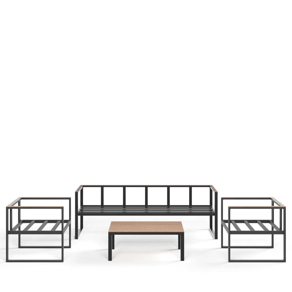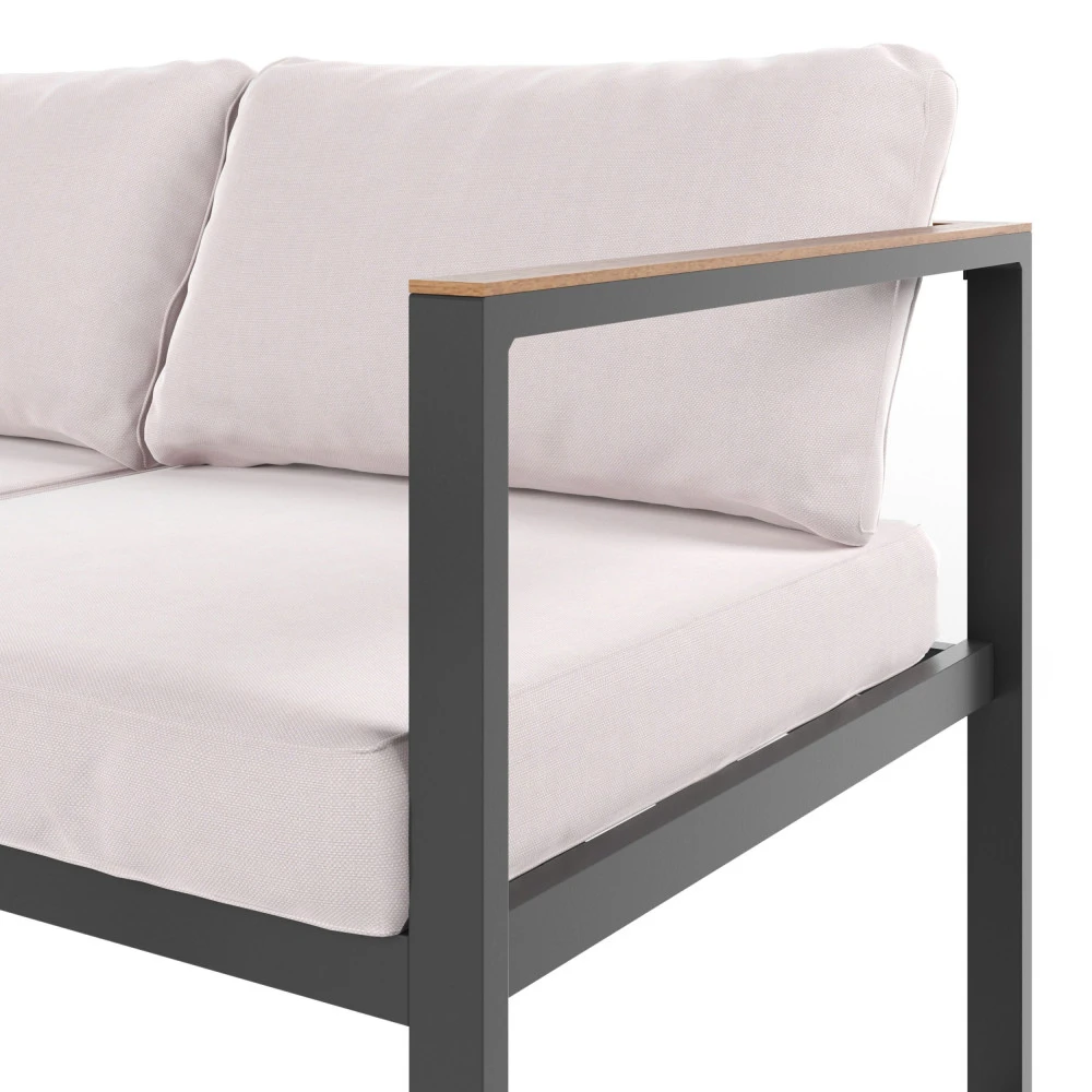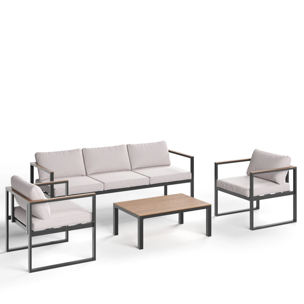 Ce salon de jardin est réalisé en aluminium, un matériau résistant aux intempéries et très léger. Vous pourrez donc en faire un espace modulable et facilement déplacer les différents éléments qui le composent. Sur le plateau à lattes de la table ainsi que sur le haut des accoudoirs et du dossier, vous remarquerez la présence de bois (contreplaqué). Celui vient rehausser le charme contemporain d’Asko.