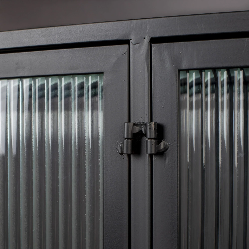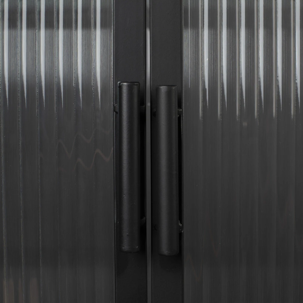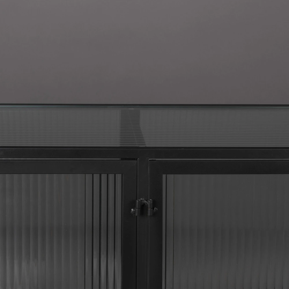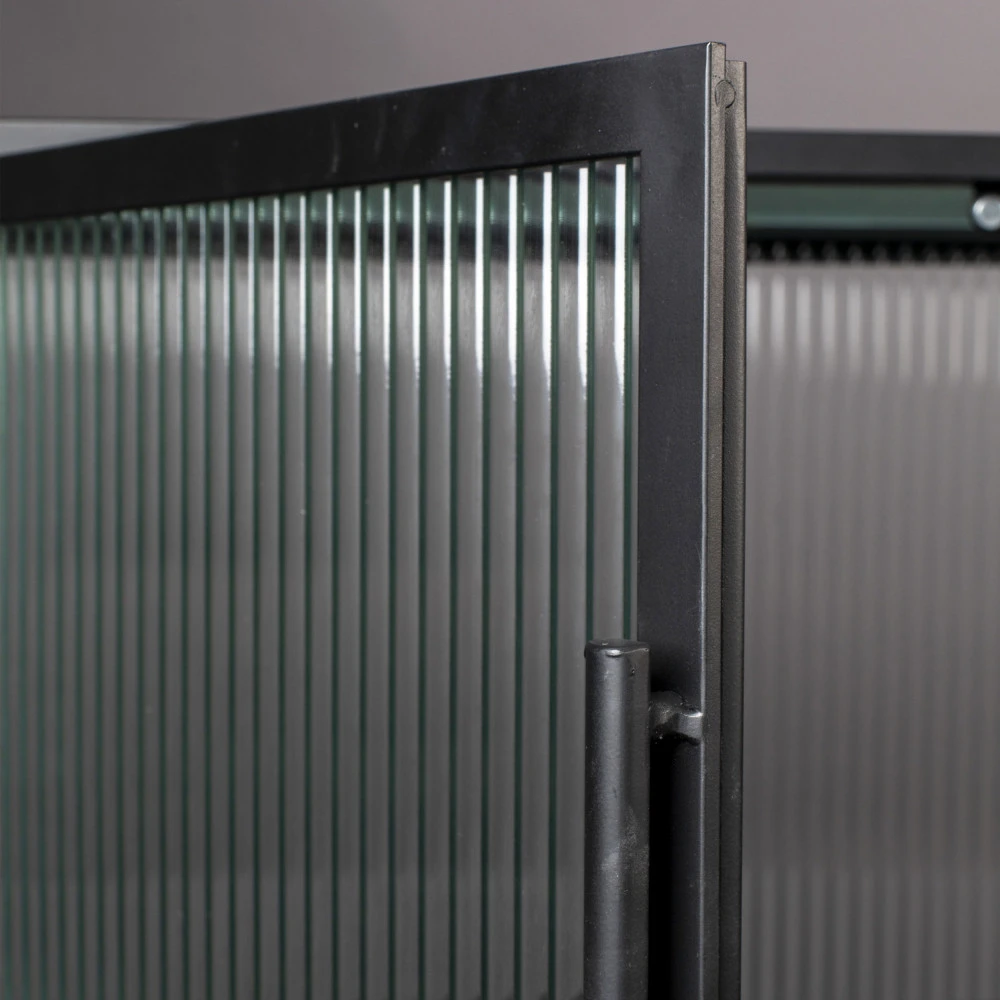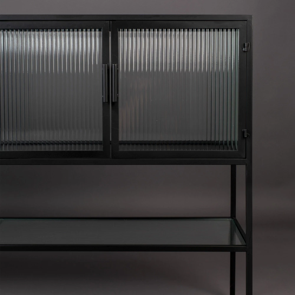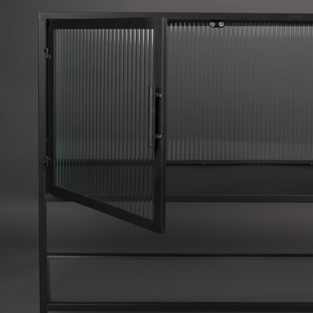 Boli est constituée d’une structure en métal noir solide, avec un design qui va à l’essentiel. Ses portes et tablettes sont toutes en verre trempé aspect strié, lui apportant transparence et légèreté. Ses 4 portes avec poignées possèdent des fermoirs aimantés. Une large tablette inférieure vous permet d’exposer d’autres objets ou paniers de rangement.