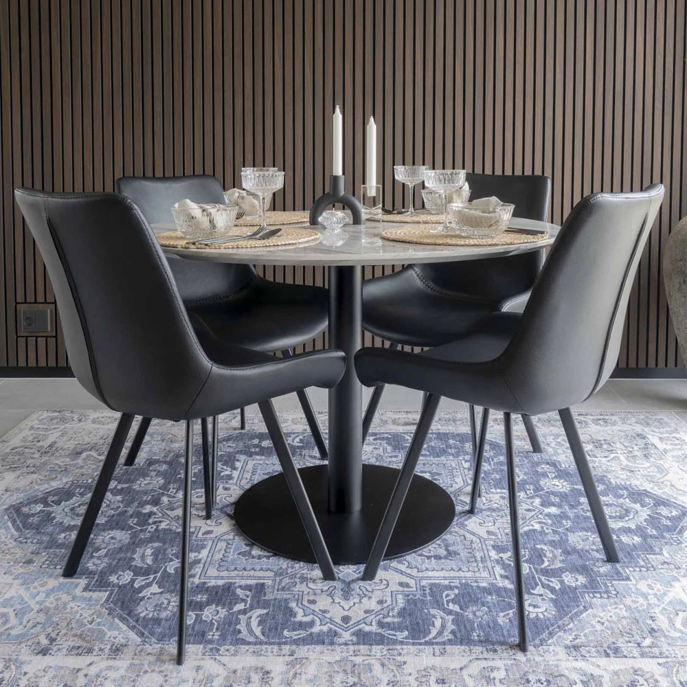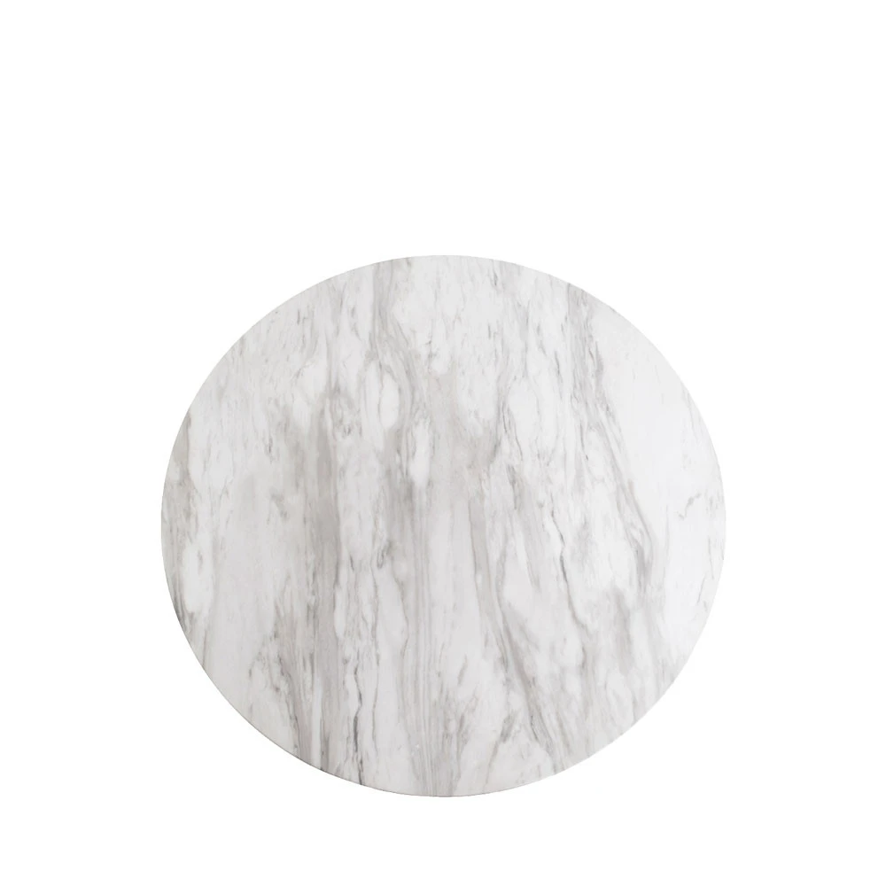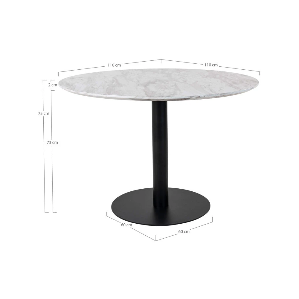 Confectionnée en acier et MDF, cette table à manger mesure 75 cm en hauteur et fait 110 cm de diamètre. Elle est composée d’un plateau rond effet marbre très élégant, puis d’un pied central cylindrique posé sur une base solide.