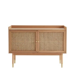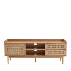 Autre bon point : ce meuble TV est Ă la fois fonctionnel et joli Ă regarder. Conçu en mĂ©laminĂ©, mĂ©dium et placage chĂŞne, il est dotĂ© de 2 niches de rangement ouvertes avec 2 passe-câbles sur le cĂ´tĂ© droit, puis d’un espace de rangement fermĂ© par une porte en partie gauche. Cette dernière se pare de cannage, pour un rendu Ă©lĂ©gant et design.