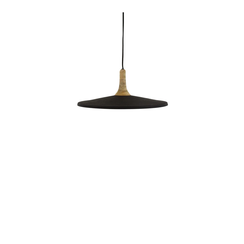 Cette suspension se compose d’un disque en métal, comme une assisette retournée, avec une base en bois de manguier. Ce n’est pas tous les jours que l’on déniche des luminaires parés de ce beau bois exotique ! Qui plus est mixé avec du métal, pour un duo de matières qui interpelle.
