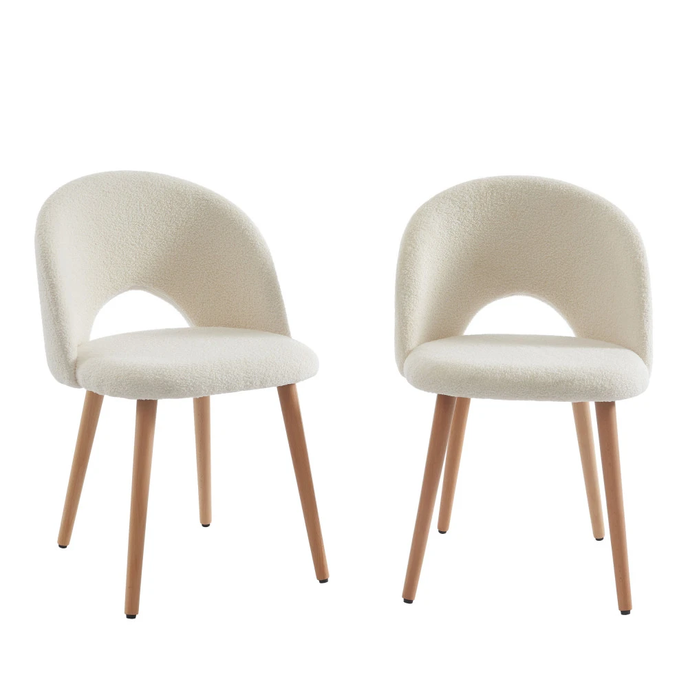 Ces chaises mesurent 77 x 56 x 52 cm. Leur structure est faite de contreplaqué et de bois massif de hêtre. Elles se parent d’un dossier enveloppant et courbé, sans accoudoirs, avec une ouverture sur le bas, et d’une assise moelleuse. Les 4 pieds obliques en bois viennent apporter un contraste de matière avec le tissu bouclette.