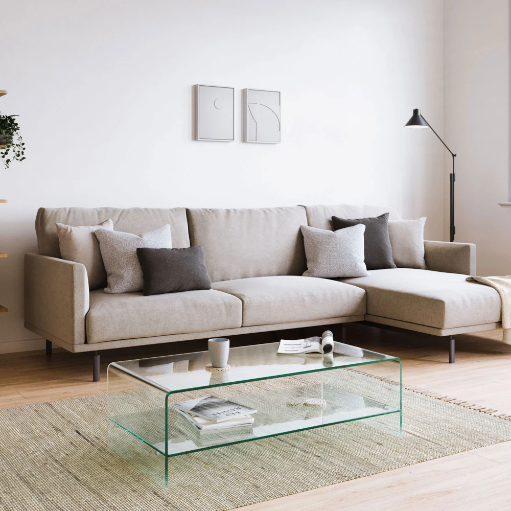 Table basse avec plateau en verre trempé transparent. Épaisseur du verre : 10 mm.