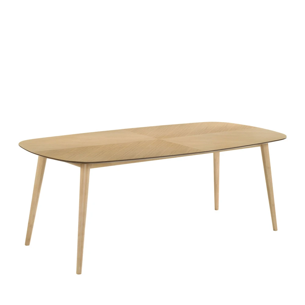 Cette table à manger conçue en bois de chêne mesure 75 cm en hauteur. Elle est dotée de 4 pieds obliques et d’un fin plateau rectangulaire avec des bords arrondis de 100 x 240 cm.