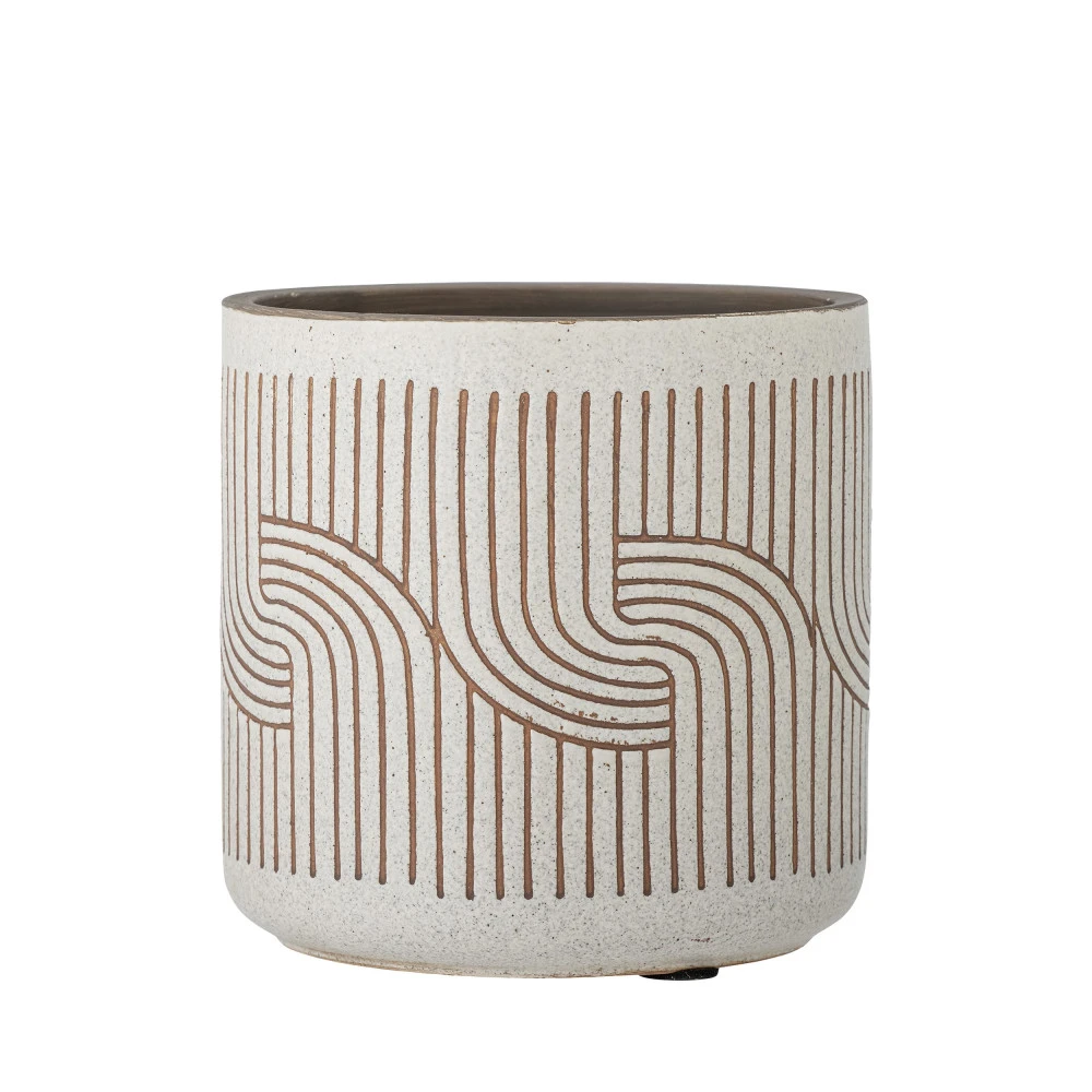 Ce pot de fleurs prĂ©sente une forme arrondie classique et mesure 20,5 cm en hauteur comme en diamètre. Il se pare d’un motif gĂ©omĂ©trique plutĂ´t contemporain, composĂ© de rayures et de vagues.