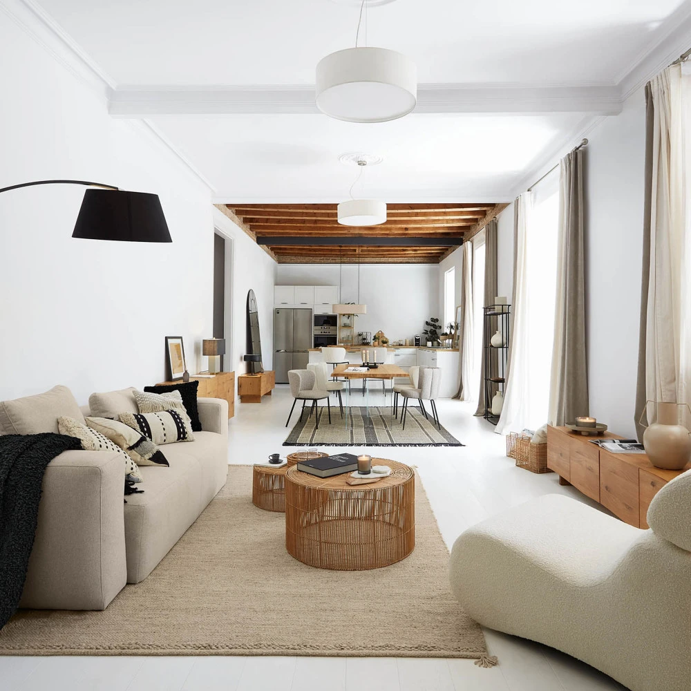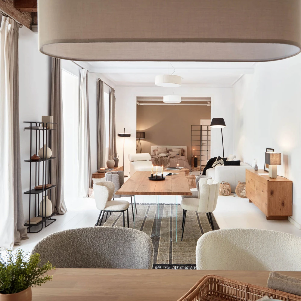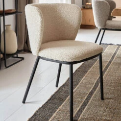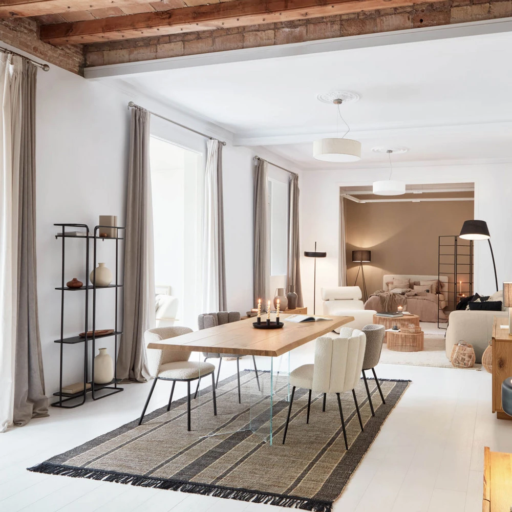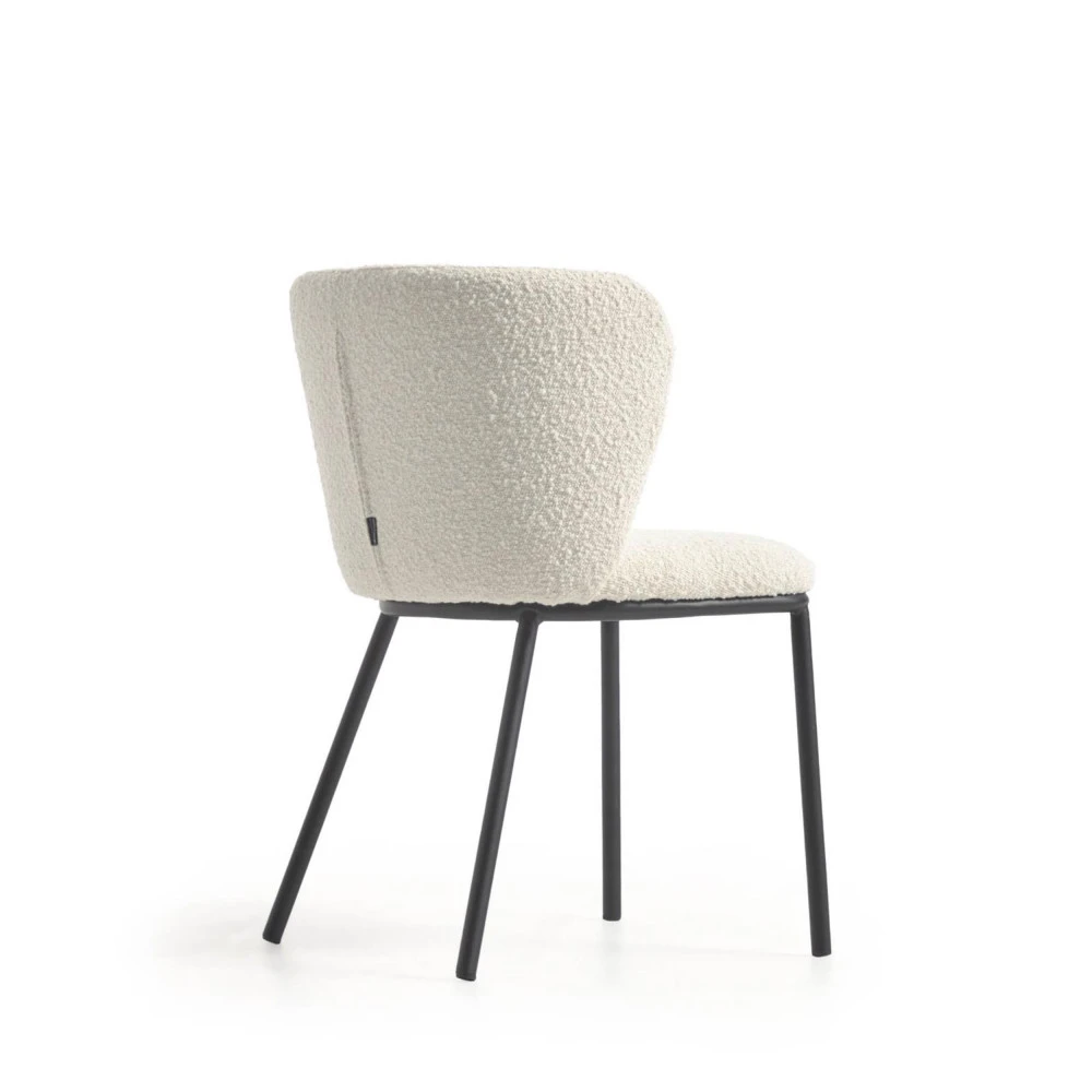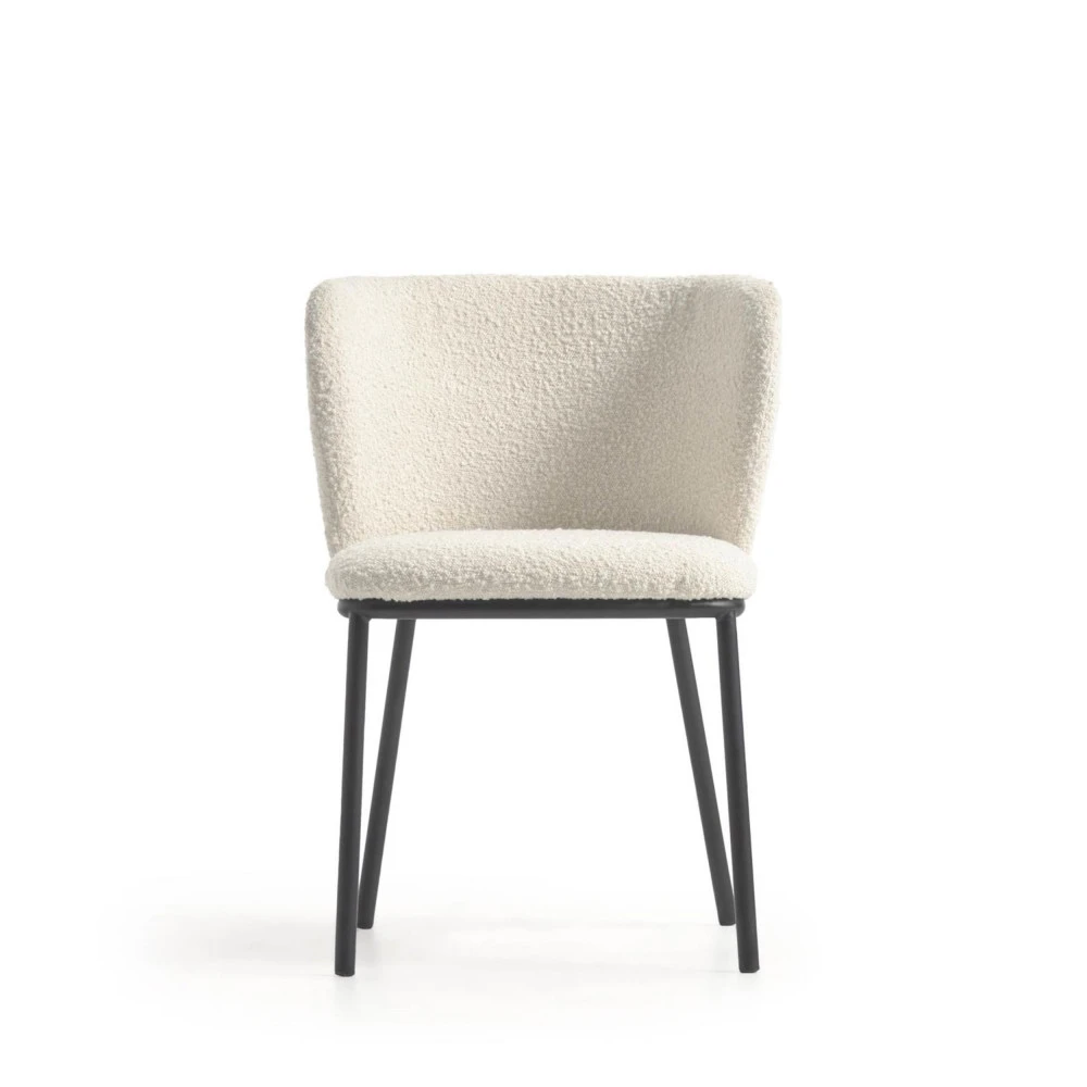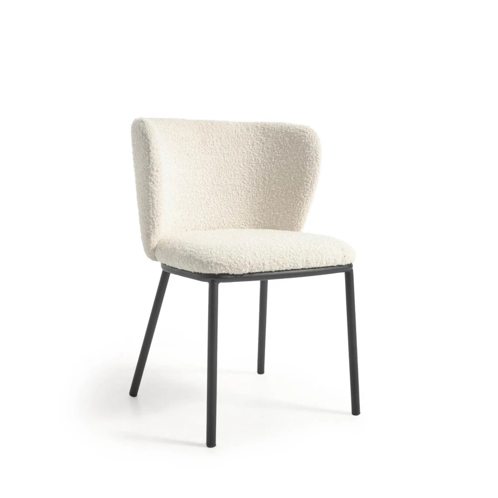 Ici, Kave Home joue sur les associations de formes et de matières pour un résultat bluffant ! La partie supérieure, tout en courbes et arrondis, s’oppose aux pieds en acier rectilignes. Le textile au fil bouclé apporte douceur et chaleur contrairement au métal qui donne à la chaise une note plus moderne et minimaliste. Les couleurs blanche et noire du tissu en bouclette superposées au noir intense des pieds créent un intéressant jeu de contrastes qui sublimera votre intérieur. Grâce aux capuchons en plastique, vous n’aurez aucun risque d’abîmer votre sol.