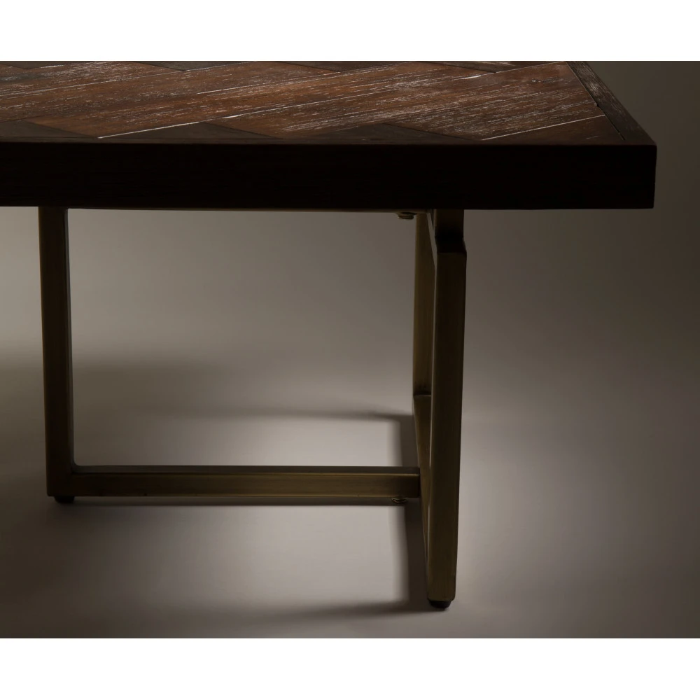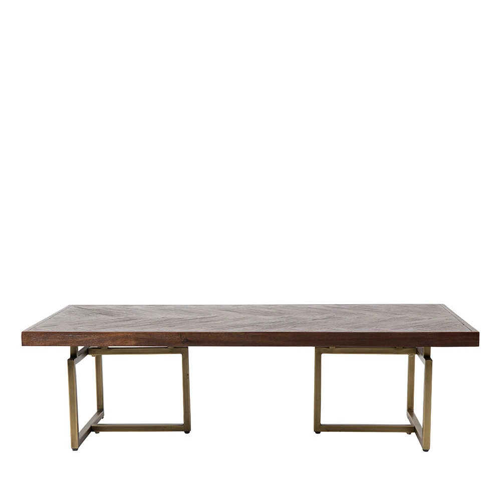La table basse design bois d’acacia et laiton Class de Dutchbone se prĂ©sente sous forme dâun plateau rectangulaire horizontal prenant appui sur une base formĂ©e dâun double cadre carrĂ© en acier doux.