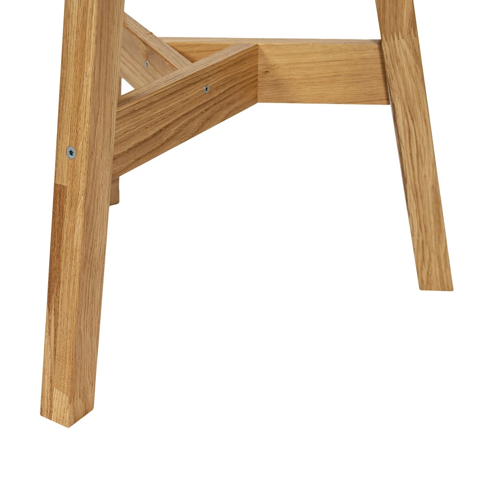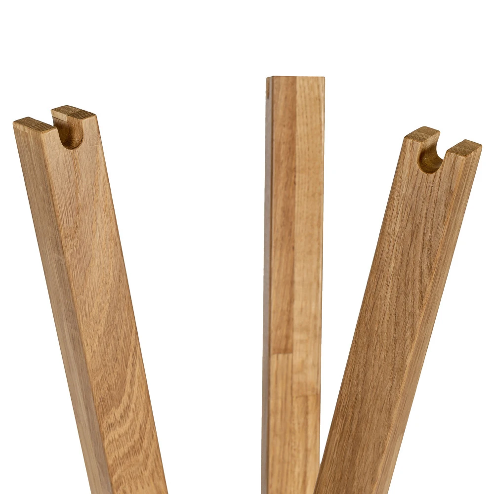 Ce porte-manteaux de qualité est conçu en bois massif de chêne. Il se compose de 3 montants croisés, avec des encoches sur le haut pour accrocher votre veste, votre lanière de sac ou encore votre écharpe. Astucieux, n’est-ce pas ? Sa base est bien stable, avec 3 panneaux qui relient les pieds.