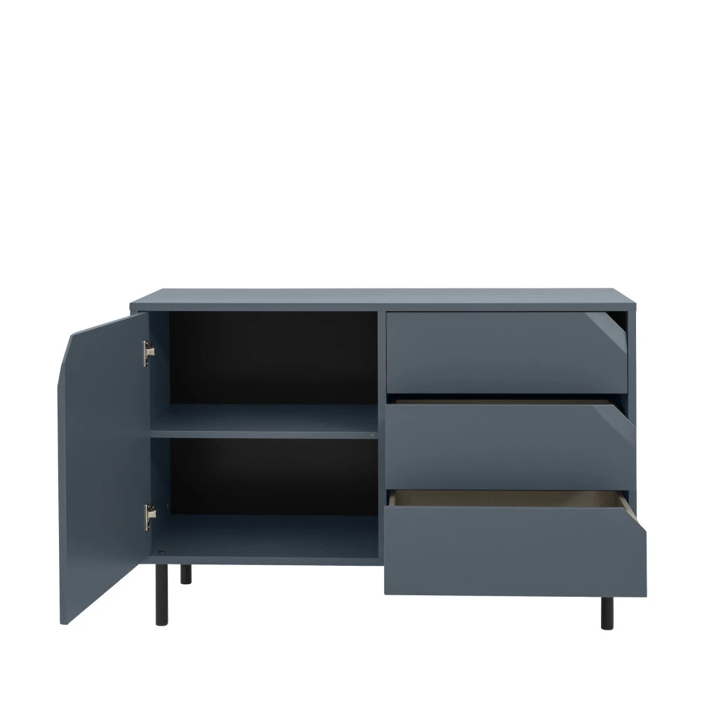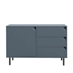 Fait à partir de panneaux de particules et médium (MDF), vous apprécierez sûrement les finitions de ce buffet dont les côtés des tiroirs présentent un aspect « effet lin » une fois ouverts. Vous pourrez également ajuster la position de l’étagère dissimulée derrière la porte. Cette caractéristique vous permettra d’optimiser le rangement et d’augmenter sa capacité de stockage en fonction de ce que vous y mettrez : verres à pied, linge de maison, petite déco de table, etc. Ce buffet mesure 77 cm de hauteur, 118 cm de largeur et 43 cm de profondeur.