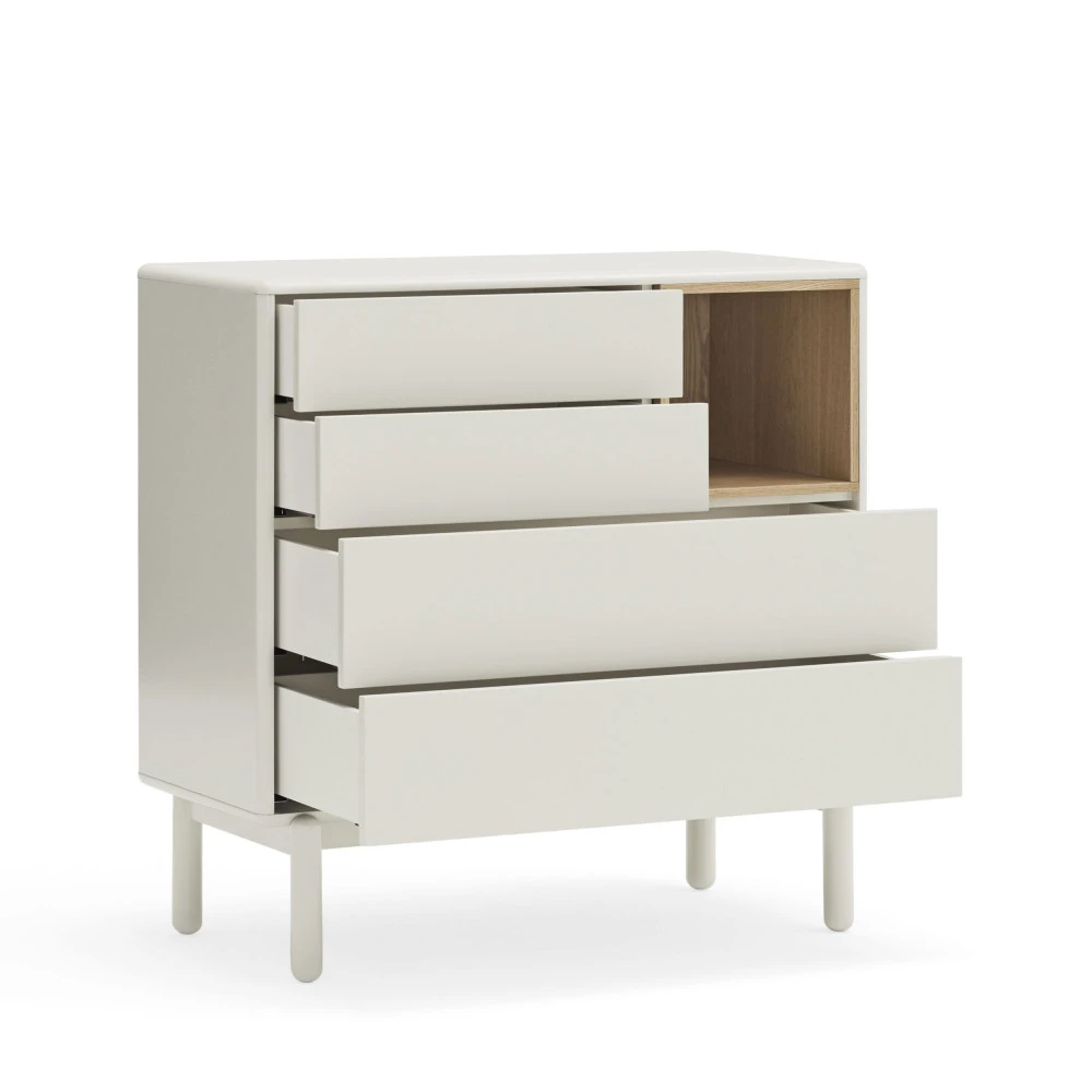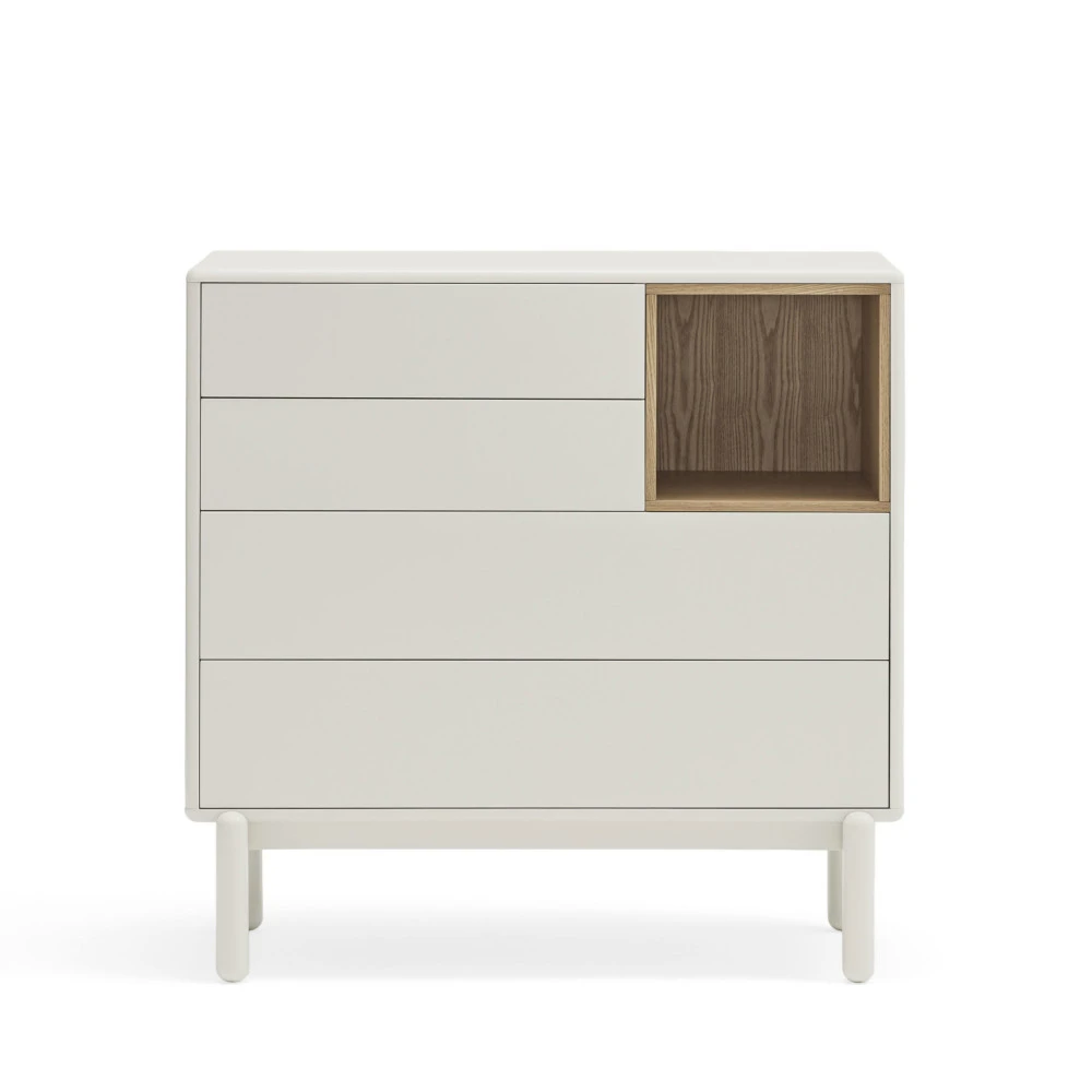 Confectionné en bois d’hévéa, ce meuble de rangement de style contemporain mesure 90 x 90 x 40 cm. Il se dote de 4 tiroirs de 2 tailles différentes ainsi que d’une niche de rangement ouverte. Sa stabilité est assurée grâce à 4 pieds cylindriques. Vous pourrez ranger des vêtements pliés en partie basse et des sous-vêtements et accessoires en partie haute. N’hésitez pas également à exploiter le dessus du meuble, en disposant des panières de rangement et vos coffrets à bijoux, ou bien tout simplement en décorant le plateau avec des bibelots, un bouquet de fleurs séchées, ou tous ces souvenirs de voyage que vous ne savez pas où placer.