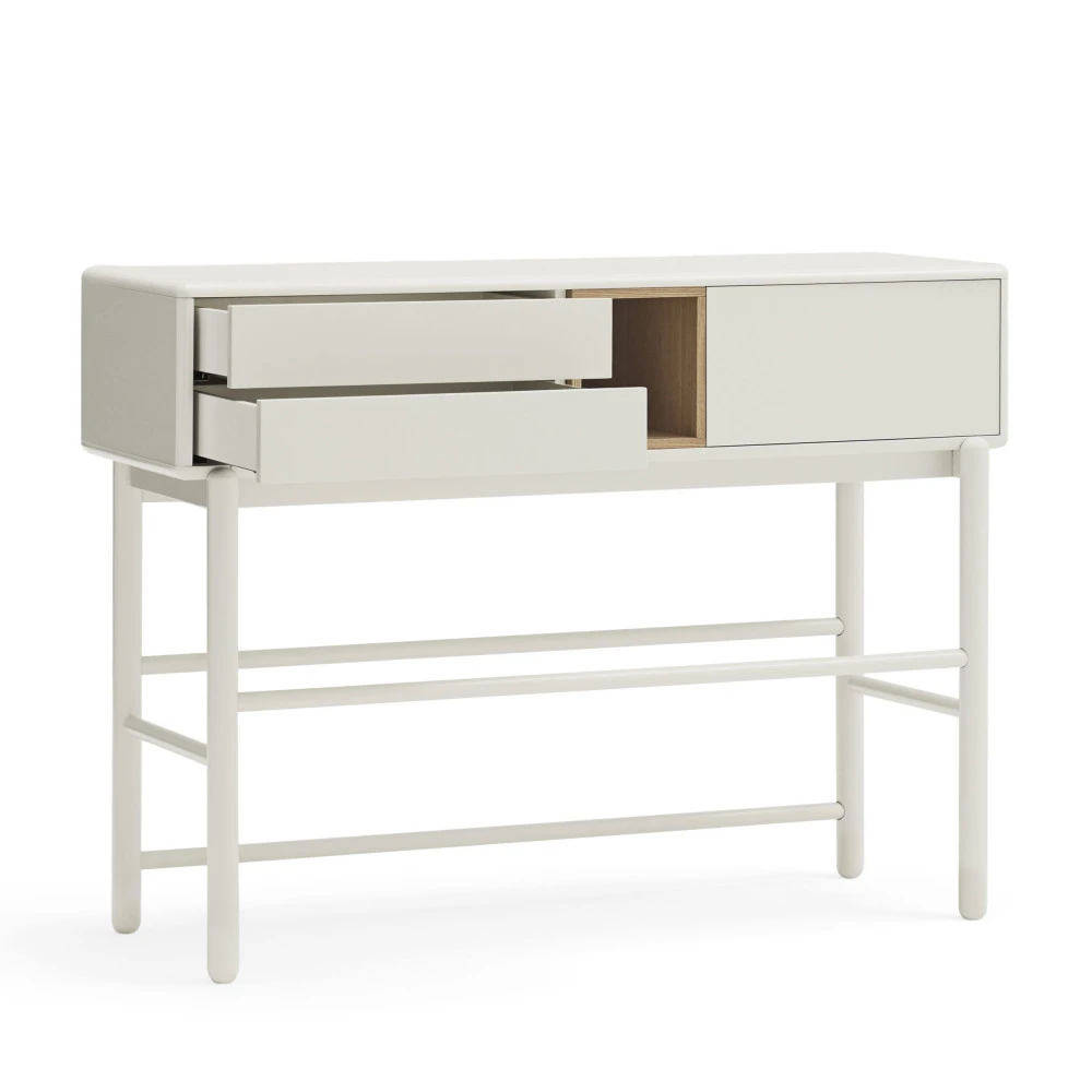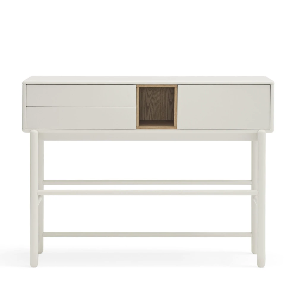 Ce meuble d’appoint confectionnĂ© en bois d’hĂ©vĂ©a mesure 90 cm en hauteur, 120 cm en largeur et 35 cm en profondeur. Très stable, il est dotĂ© de 4 pieds cylindriques reliĂ©s sur tous les cotĂ©s. De forme rectangulaire, cette console de style contemporain tout en simplicitĂ© sera très pratique au quotidien. Elle est pourvue de 2 tiroirs du cĂ´tĂ© gauche, d’un espace de rangement fermĂ© par une porte sur la droite puis d’une niche de rangement ouverte au centre. VoilĂ de quoi ranger une foule de choses : documents, clĂ©s, laisse du chien et autres effets personnels. Le plateau supĂ©rieur peut Ă©galement ĂŞtre exploitĂ© avec des panières de rangement, ou tout simplement ĂŞtre dĂ©corĂ© avec un bouquet de fleurs ou le bibelot de votre choix.