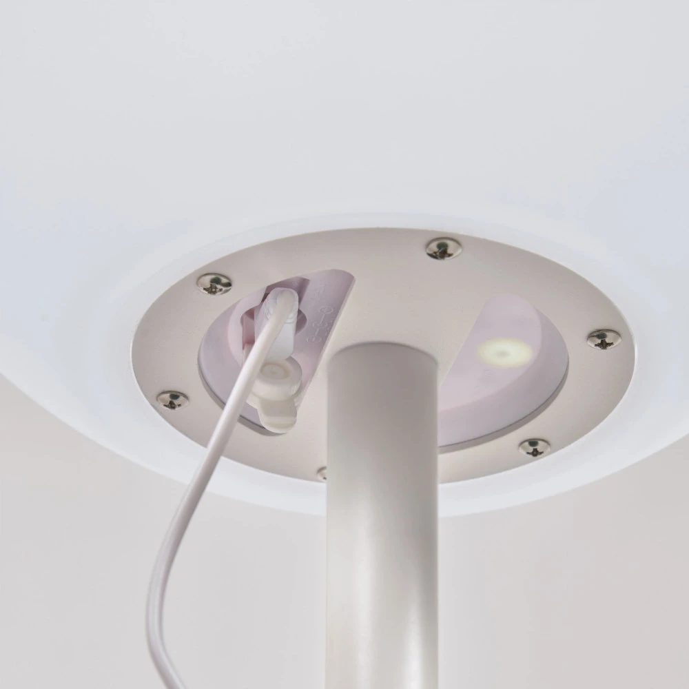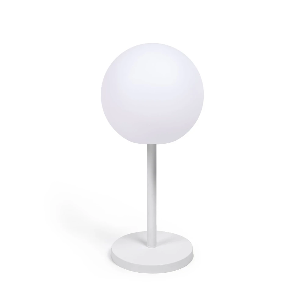 Cette lampe à poser blanche de style contemporain est fabriquée en métal et plastique et affiche une dimension de 64x30cm. Conçue pour un usage à l’abri, elle fonctionne sans prise, sur batterie. Le chargement de celle-ci se fait par connexion USB. Pratique si vous n’avez pas de prise dans votre extérieur.