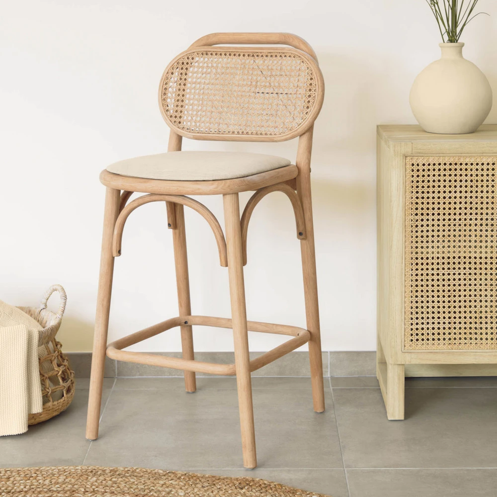 Surfant sur la vague du rotin, ces chaises hautes en chêne massif sont parfaites pour apporter un côté exotique et raffiné à la déco intérieure. On adore les lignes de ces 2 tabourets de bar Doriane qui se veulent à la fois actuelles et chaleureuses. Tout leur charme repose sur leur dossier agrémenté de rotin tressé à la main. L’assise est habillée d’un tissu effet lin conférant à ces pièces une apparence soignée et élégante. Grâce à leur forme sobre et leur couleur naturelle, les chaises de bar Doriane peuvent s’allier à différents styles déco : bohème, ethnique, scandinave…