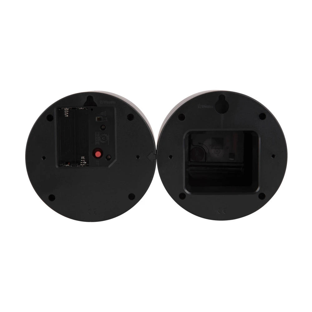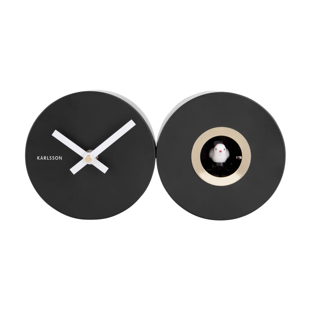 Cette horloge double en acier, qui fonctionne avec 3 piles AA (non fournies), mesure 13 x 26 x 7,2 cm. Elle se compose de 2 parties rondes, l’une avec aiguilles mais sans chiffres, et la seconde avec un oiseau chanteur. Toutes les heures, le coucou apparaît et émet des sons inspirés de la forêt.