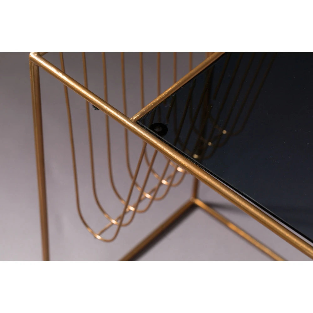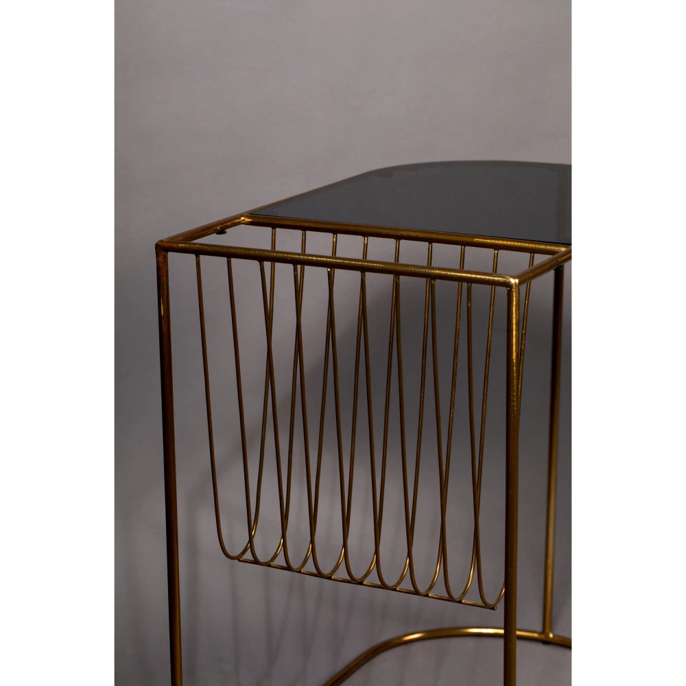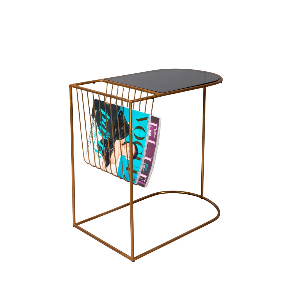 Rien qu’avec sa structure en métal parfaitement dessinée, la table d’appoint Eileen ajoute une note résolument design à votre espace. Cette table vintage étonne par sa forme peu commune qui rappelle légèrement un panneau de basket. Faisant la part belle à des matériaux nobles, ce modèle se dote d’un plateau en verre trempé de couleur noire pour apporter une touche raffinée et singulière à l’intérieur. Son cadre en fer enduit de poudre et équipé de protections en caoutchouc arbore une teinte dorée scintillante. Avec un design qui combine esthétique et commodité, Eileen est équipée de porte-revues pour accueillir vos magazines préférés.