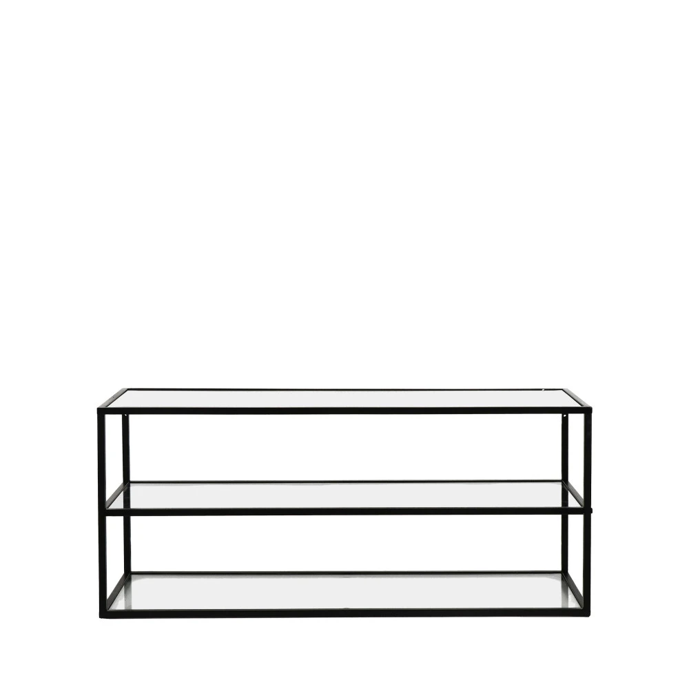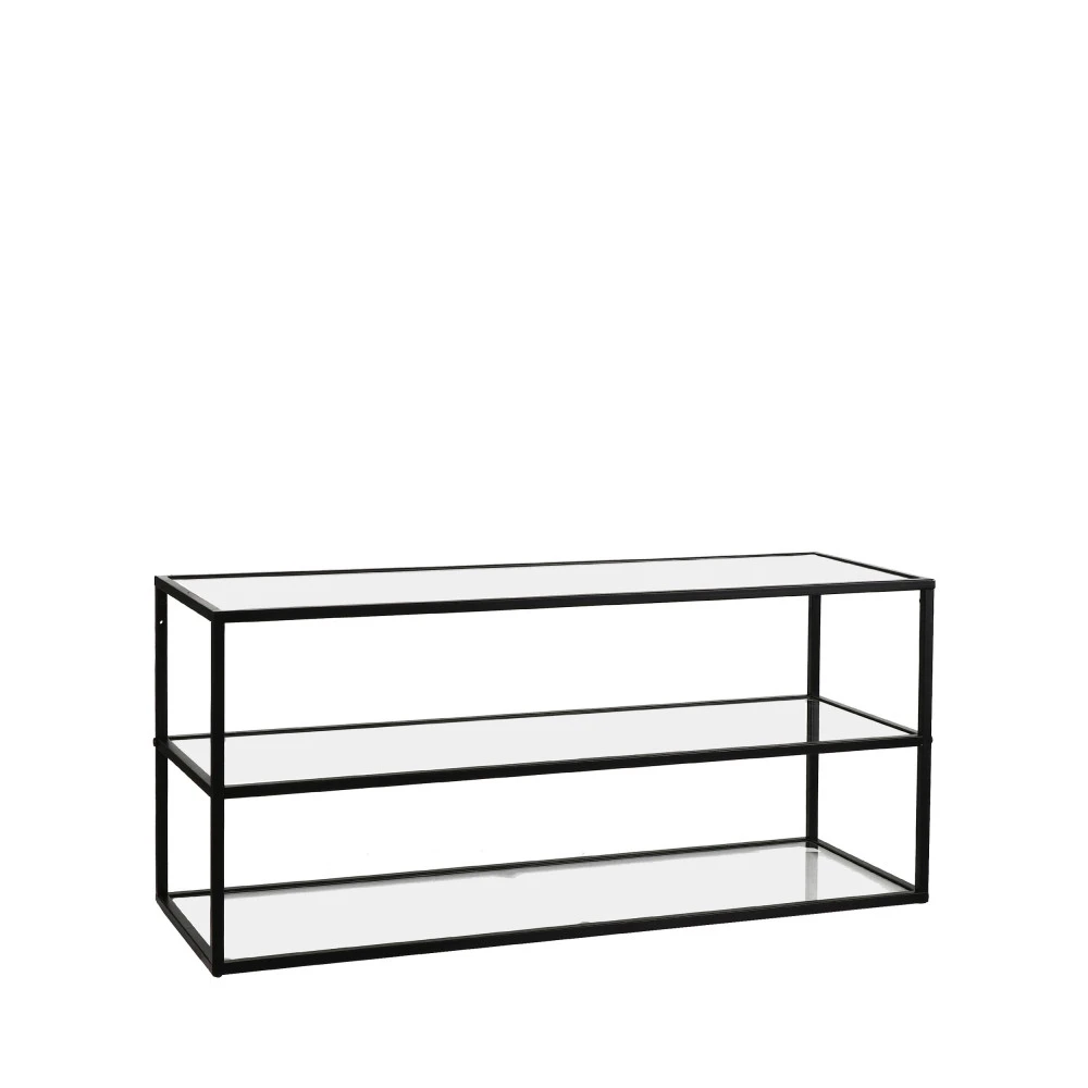 Cette grande étagère mesure 90 cm en largeur et 40 cm en profondeur. Elle est pourvue de 3 plateaux en verre et d’une structure en métal noir. Elle offre un très bel espace de rangement : parfait pour trouver une place à toutes les petites choses qui traînent à la maison. Sur cette triple étagère, vous pourrez présenter de beaux objets déco, des petites plantes d’intérieur, des cadres photos, des bougies parfumées ou autre collection de bibelots chère à votre coeur.