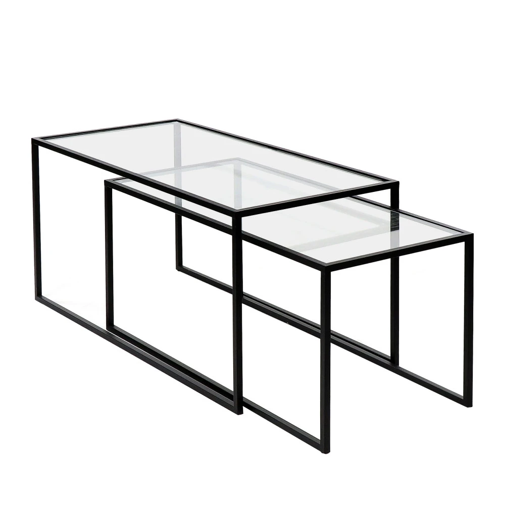 Ces 2 tables basses rectangulaires affichent le même design mais des dimensions différentes. La plus grande mesure 40 x 40 x 80 cm et la seconde fait 35 x 35 x 75 cm. Elles se parent toutes deux d’un plateau en verre et d’une structure en métal noir. Les pieds, plutôt fins, sont uniquement reliés à la base sur la longueur pour un look épuré.