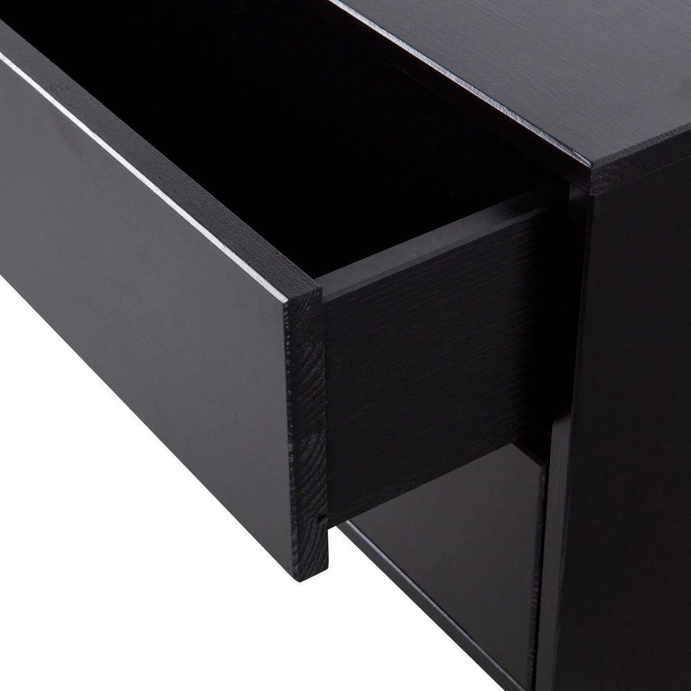Et pour le reste des dimensions, Finca mesure 40 cm de hauteur et seulement 40 cm de profondeur, autant dire qu’il pourra se faufiler partout au salon ! Continuons les bonnes nouvelles : ce meuble est réalisé dans un bois massif de pin et teinté dans un noir ébène hautement désirable. Sa silhouette ultracontemporaine fait fi des poignées de tiroirs pour les remplacer par un astucieux système de push-to-open.