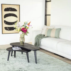 Ces tables basses sont toutes 2 confectionnées en bois massif (manguier), un beau bois exotique, dont on voit ici les jolies veinures naturelles sous la peinture. Ces tables robustes affichent le même style, avec un plateau à la forme organique tendance et des pieds larges coniques en biais. Vous aimez ce genre de design ? Elles seront parfaites dans un intérieur à la déco contemporaine.