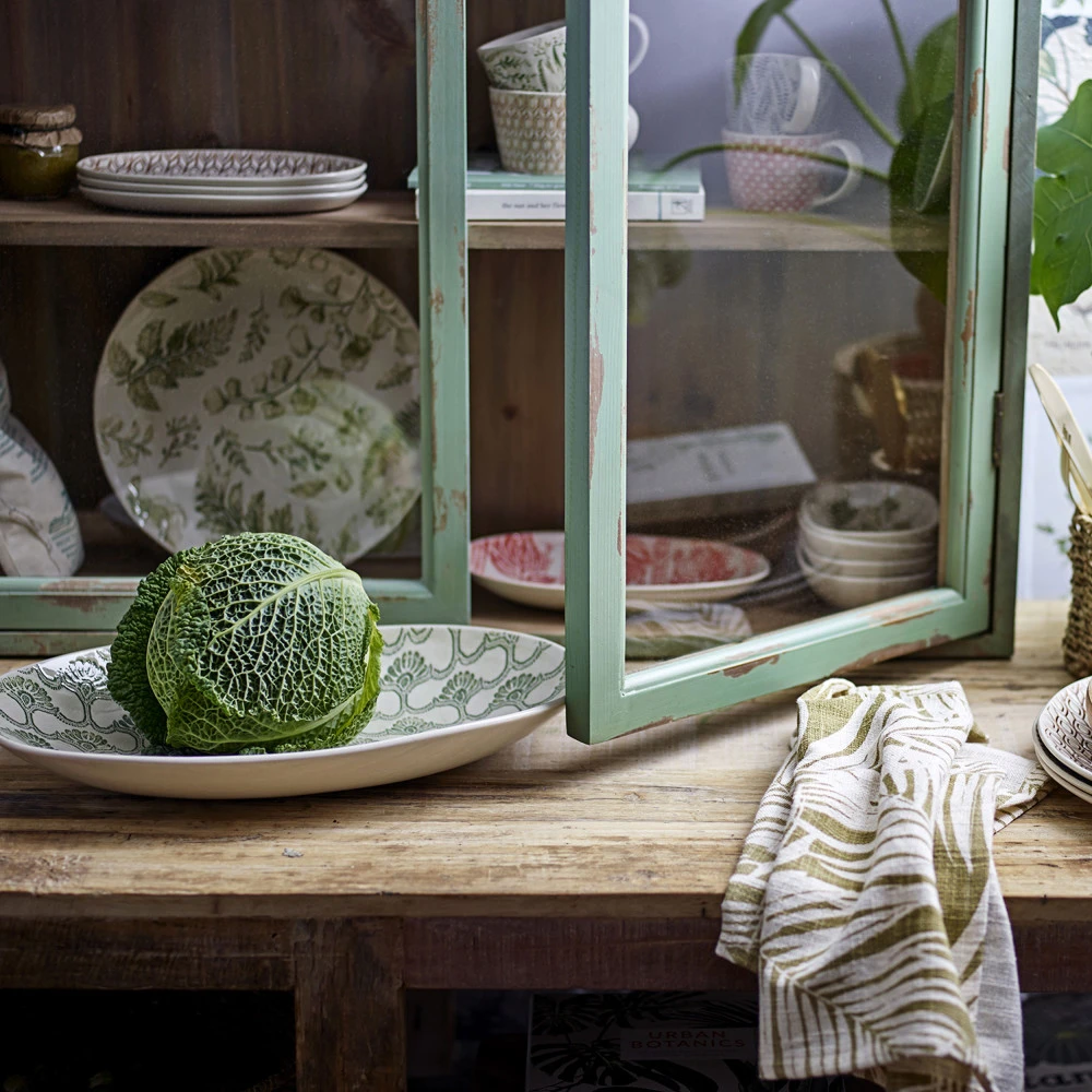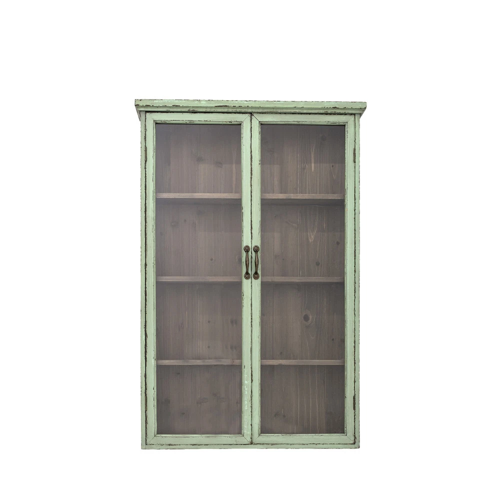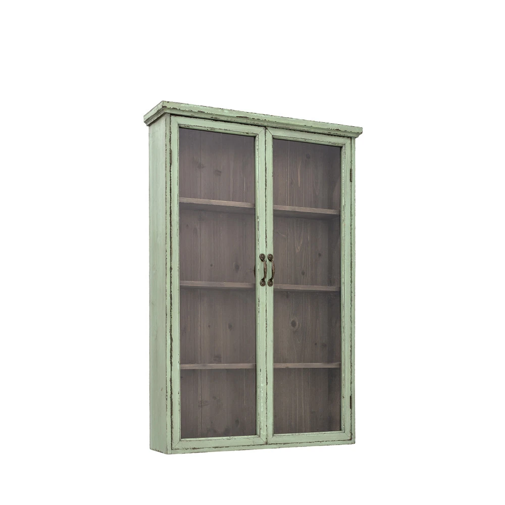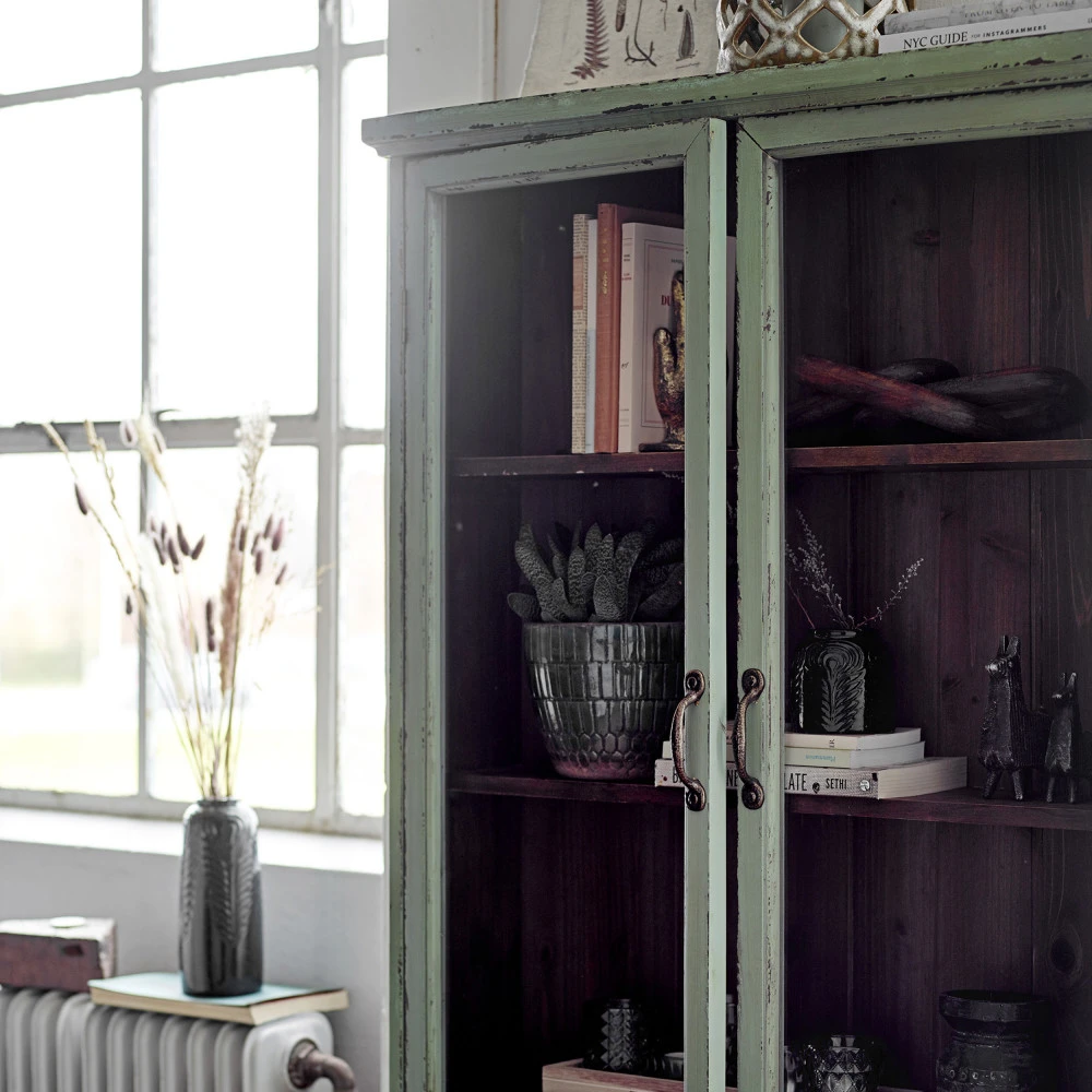 Hazem, la vitrine 2 portes en bois se pare d’un charme retro marqué pour créer une ambiance rustique unique dans la maison. Le bois et la teinte vert pastel en font un ensemble authentique. Elle comporte 3 étagères profondes et bien espacées pour offrir plusieurs possibilités de rangement. Les portes vitrées permettent d’exposer de jolis objets en toute fierté.