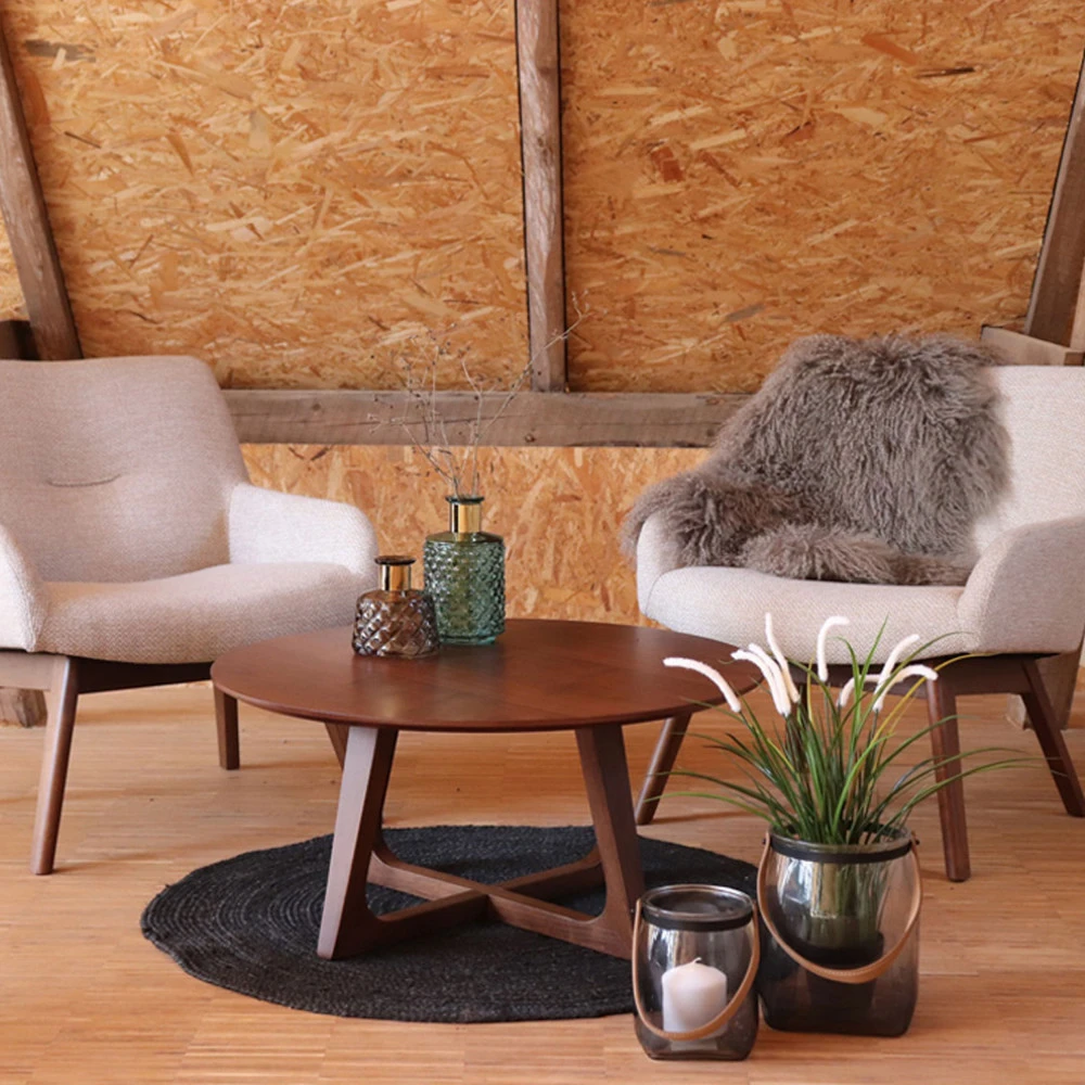 Cette table basse en bois est dotée d’un plateau rond de 75 cm de diamètre avec des pieds épais croisés, créant une base solide. Elle pourra s’entourer de fauteuils de style scandinave avec pieds en bois pour créer un coin cosy dans la pièce de vie. Vous pourrez alors bouquiner tranquillement ou prendre l’apéritif. Côté déco, n’hésitez pas à déposer sur cette table basse des vases très contemporains pour mixer les styles.
