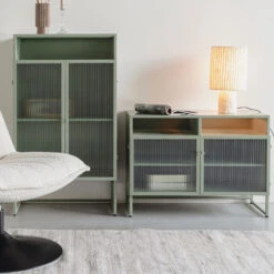 Vous cherchez un buffet à la fois moderne, original et design ? La pièce qu’il vous faut est juste ici ! Il s’agit du buffet bas à portes vitrées en métal Herbe. Un meuble à placer dans une bibliothèque, une salle à manger ou à utiliser en guise de meuble télé, et qui mettra joliment en valeur tous les objets dont il sera rempli grâce à ses portes en verre trempé. Servez-vous de ce meuble de rangement pour entreposer de la vaisselle, des bouquins ou des dossiers professionnels, ou transformer-le en support pour mettre en valeur un miroir à poser ou votre sculpture préférée.