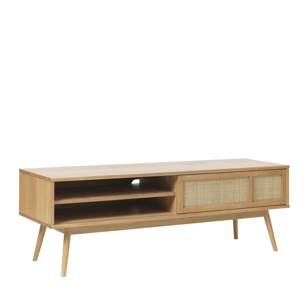 Lorsqu’on fait glisser la porte, se dévoile alors le second atout du meuble TV Kiyo : son grand espace de rangement. Avec ses deux étagères d’un côté et son grand compartiment de l’autre, vous pourrez glisser dans ce meuble magazine, box TV ou console. Et le volet de rotin vous permettra même de dissimuler le bazar que vous ne voulez pas montrer. Ultime détail, le passe-câbles prévu sur l’arrière vous évitera les fils disgracieux.