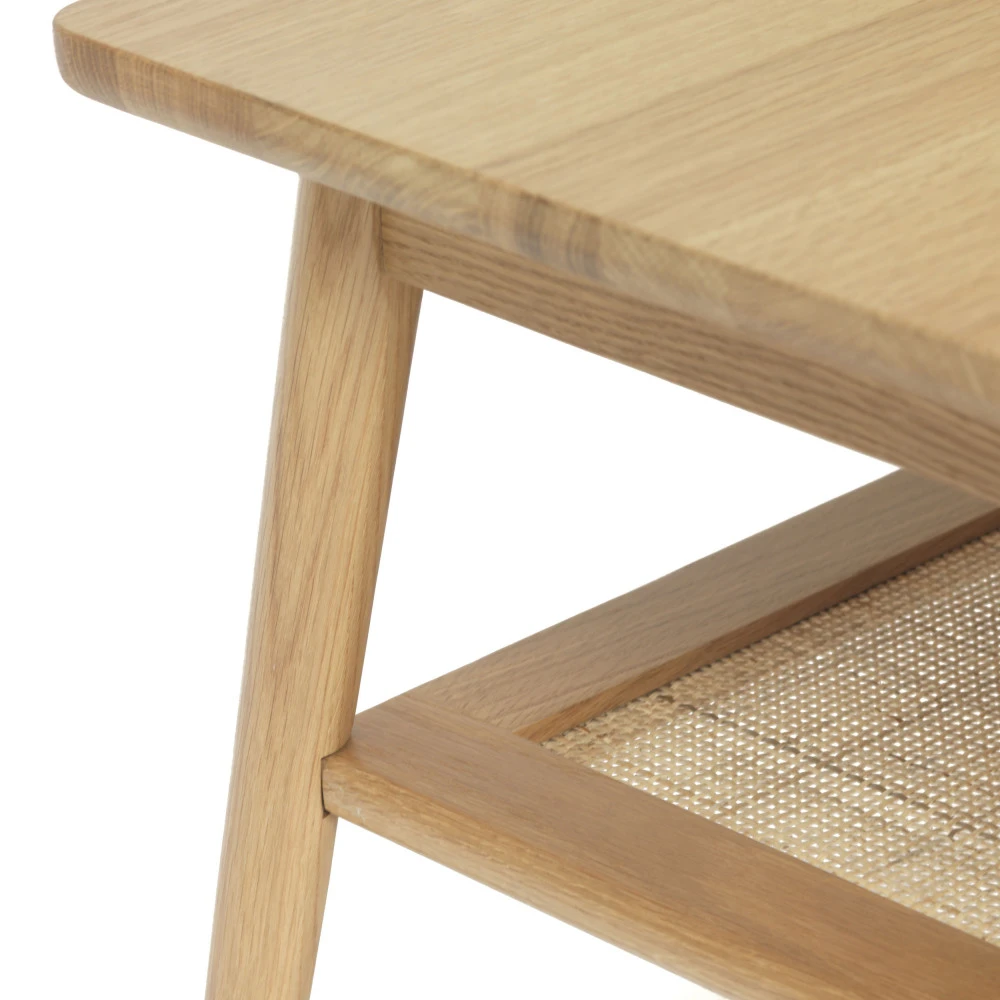On remarque ensuite la tablette inférieure en rotin : un choix de style assumé, qui offre à la table basse Kiyo une légèreté bienvenue et une touche déco 2023 au diapason. Et que dire de ses 4 pieds fins et ronds, posés en biais ? Qu’ils donnent justement envie de mettre de la musique. Alors, on danse avec Kiyo ?