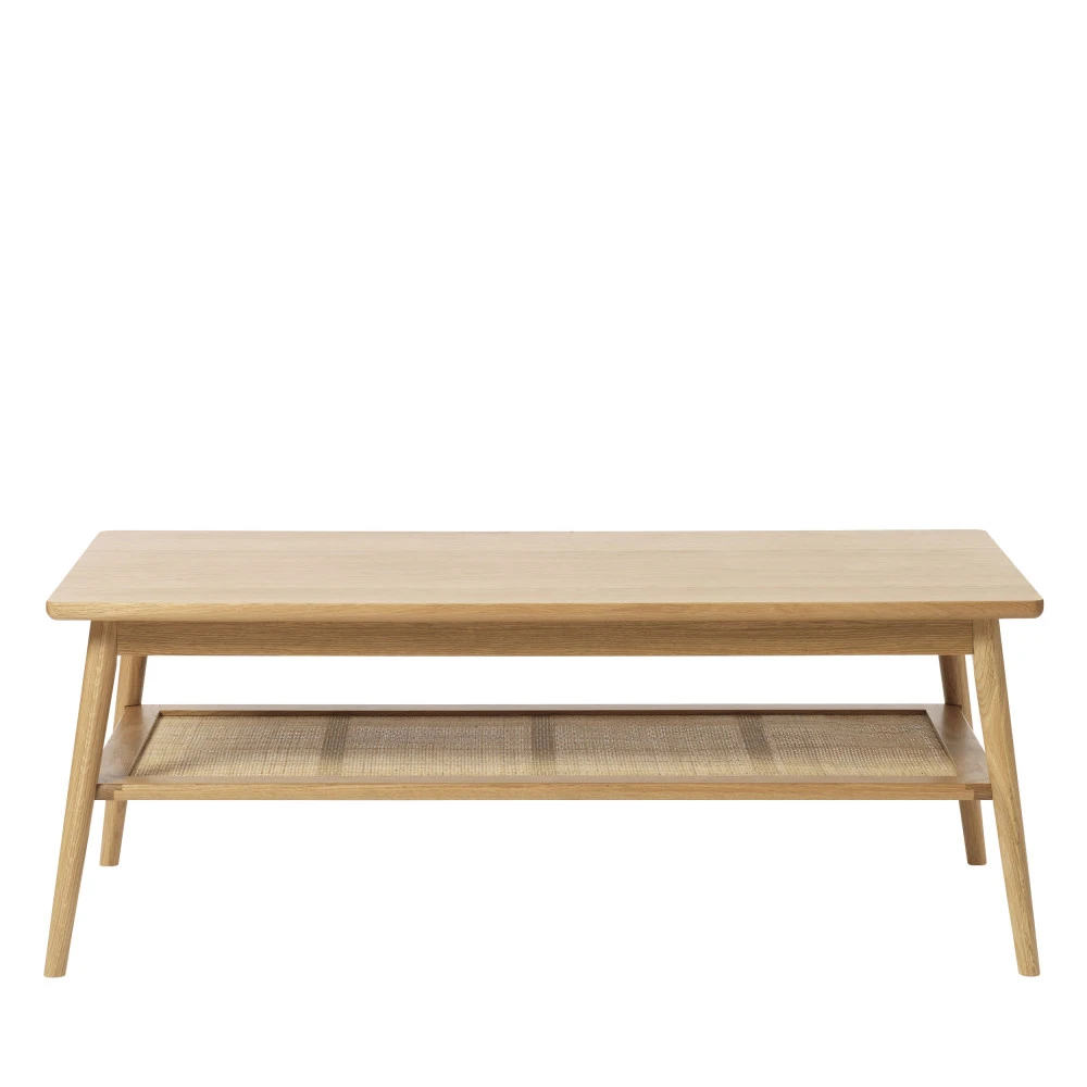 Et maintenant, rentrons dans le vif du sujet : la table basse Kiyo a de très solides arguments. On commence par son matériau solide, un plaquage de chêne qui ne vous laissera pas tomber au premier plateau-repas. Le plateau rectangulaire a une allure intemporelle, mais sublimée par la teinte claire et lumineuse de l’ensemble. À harmoniser avec un divan pastel ou foncé, comme vous voulez.