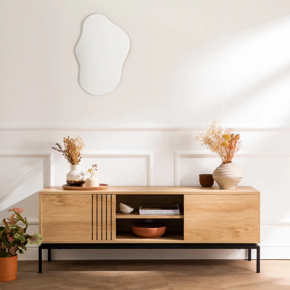 Ce meuble de 150 cm de long se compose de 2 niches dans la partie centrale et de 2 espaces de rangement clos. On sait pertinemment qu’une télé ne fait jamais cavalier seul ! Elle est souvent accompagnée d’une ou plusieurs consoles de jeux, de télécommandes et de tout en tas de câbles électroniques. Drawer a pensé à tout en vous permettant de stocker ce matériel.