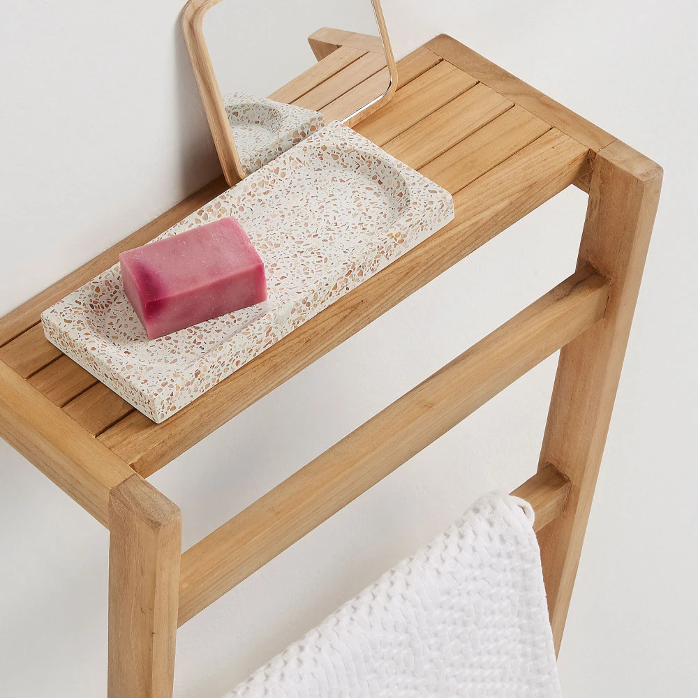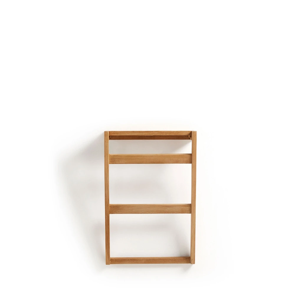 Dans une optique d’optimisation de l’espace et de fonctionnalité, Kave Home a coiffé ce porte-serviettes d’une tablette de 20 cm de profondeur. Vous pourrez ainsi y déposer savon, shampoing et soins en tout genre.