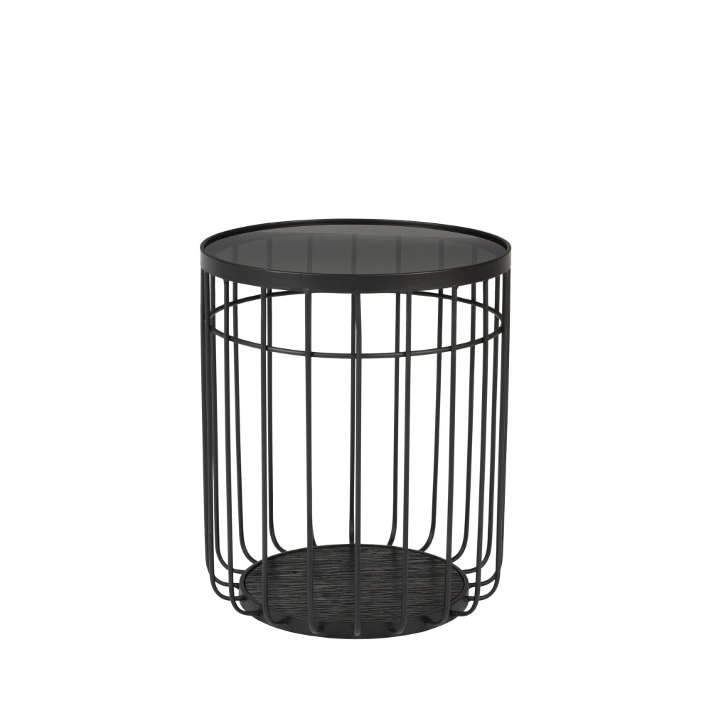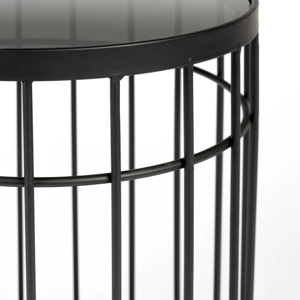 Le piétement est réalisé en métal noir. Il ne s’agit pas d’un pied plein ; celui-ci est ajouré pour plus de légèreté. Vous serez sûrement conquis par l’effet miroir offert par le verre trempé du plateau. Les bords surélevés vous permettront quant à eux d’y déposer sereinement vos petits objets de décoration.