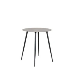 Cette table mesure 68 cm en hauteur et fait 60 cm de diamètre. Elle se dote d’un fin plateau rond en céramique effet marbre, puis de 4 pieds obliques en acier plutôt fins eux aussi.