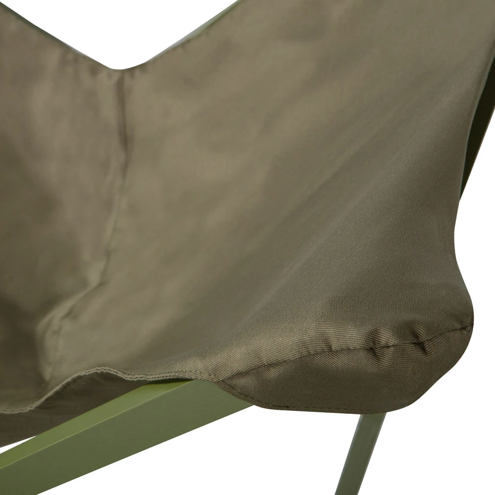 Ce fauteuil de 92 x 77 x 85 cm se compose d’une assise en tissu (polyester) à la forme bien enveloppante et d’une structure croisée en métal. La position est parfaite pour se détendre au maximum. En plus, ce modèle est pliable, ce qui est bien pratique lorsque l’on veut le ranger quand le temps se gâte ou hors saison.