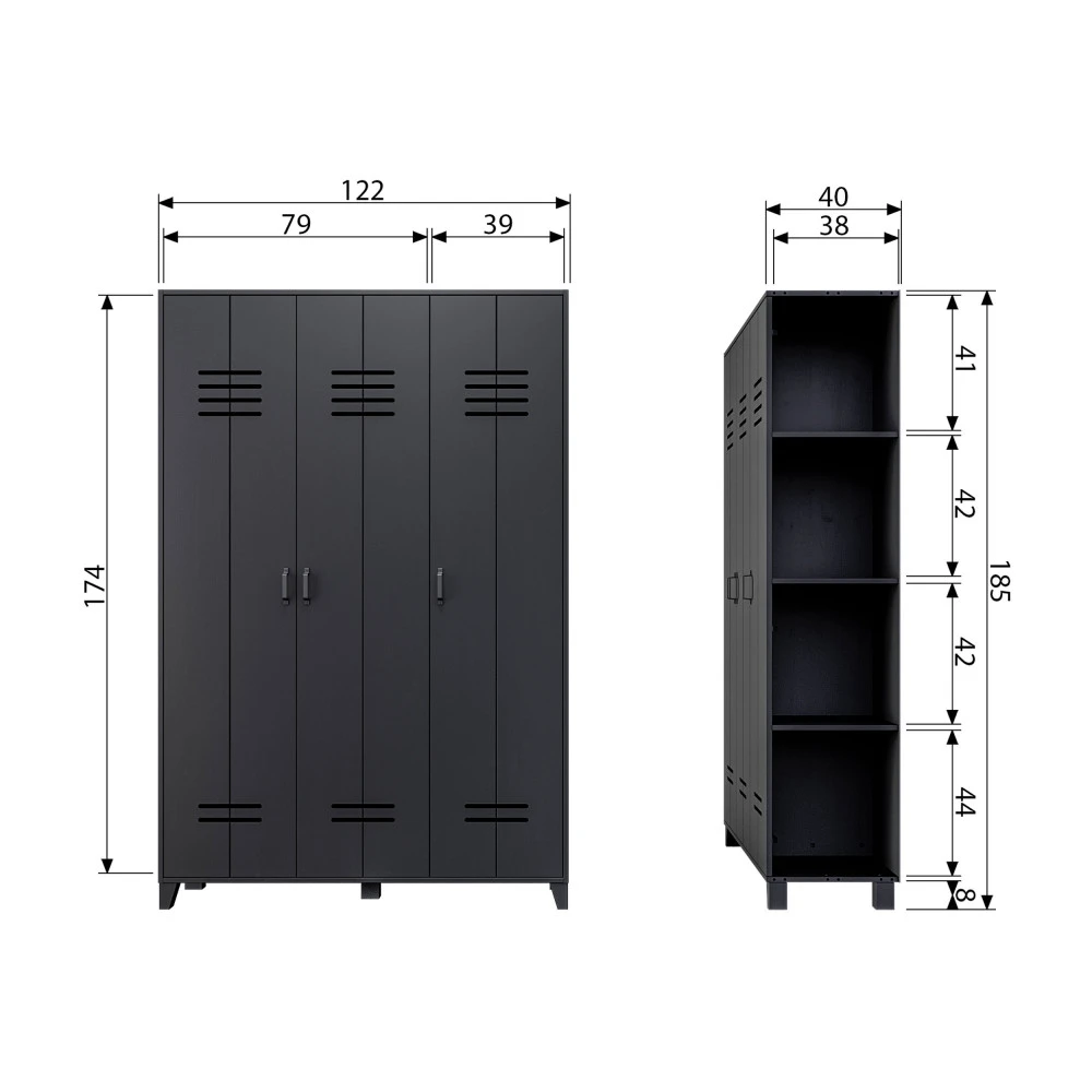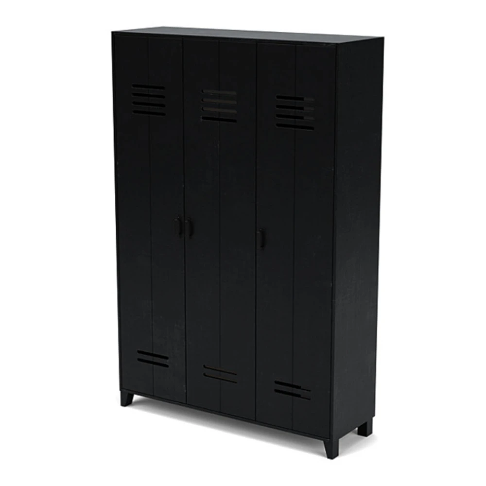 Pour compléter votre salon ou encore votre espace de bureau, adoptez l’armoire vestiaire à 3 portes de la collection Locker. Elle est fabriquée à partir de pin massif et est entièrement peinte en noir, un vrai meuble polyvalent qui se fond dans le décor. Pour ranger les objets qui traînent ou encore les documents importants, elle est idéale. Et entre nous, c’est la meilleure solution pour garder un semblant d’ordre : on n’a pas toujours le temps de faire LE grand ménage. En termes de dimensions, cette armoire a une hauteur de 186 centimètres pour une largeur totale de 123 centimètres et une profondeur de 40 centimètres. Derrière chaque porte, il y a 4 compartiments d’une profondeur de 37.8 centimètres.