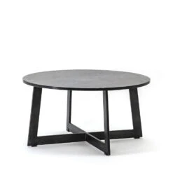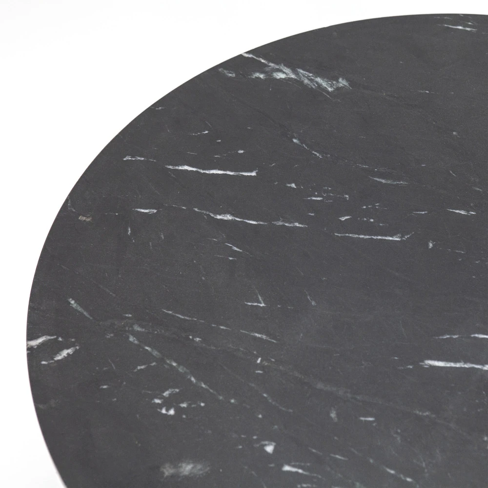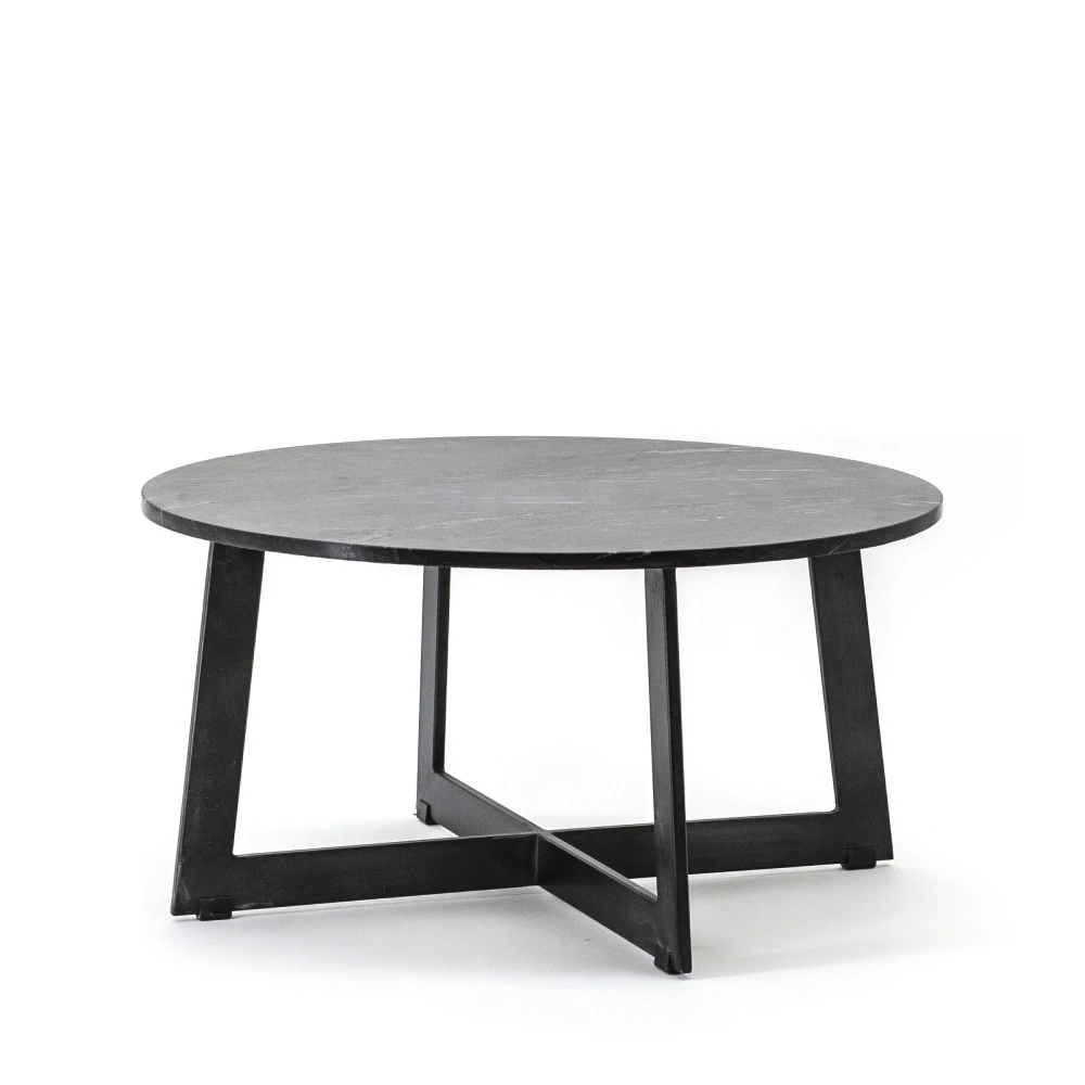 Ce modèle fait 35 cm en hauteur et 70 cm de diamètre : voilà donc des volumes généreux. Côté look, cette table basse est à la fois moderne et indémodable, élégante tout en étant assez simple. Elle se dote d’un plateau en marbre à la forme ronde classique d’épaisseur moyenne, puis d’un piètement en métal. Les 4 pieds larges évasés sont liés en croix sur le bas avec des patins, formant une base bien robuste. On aime les veinures naturelles du marbre, qui font tout le charme de cette matière, et l’alliance avec le métal ton-sur-ton est parfaite.