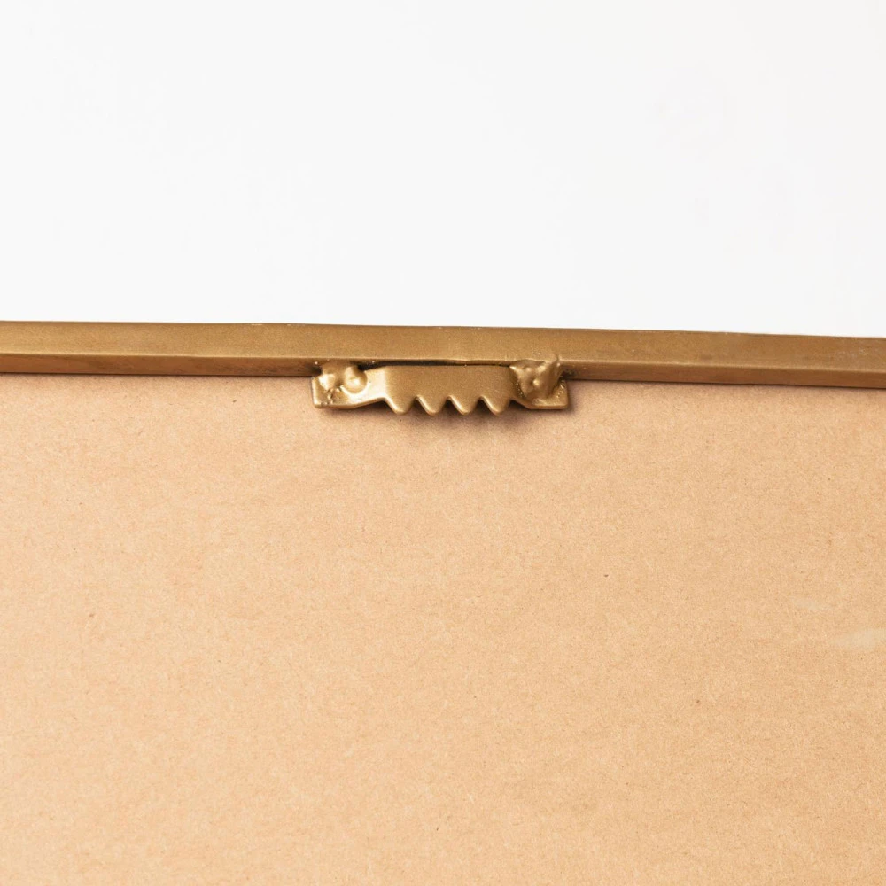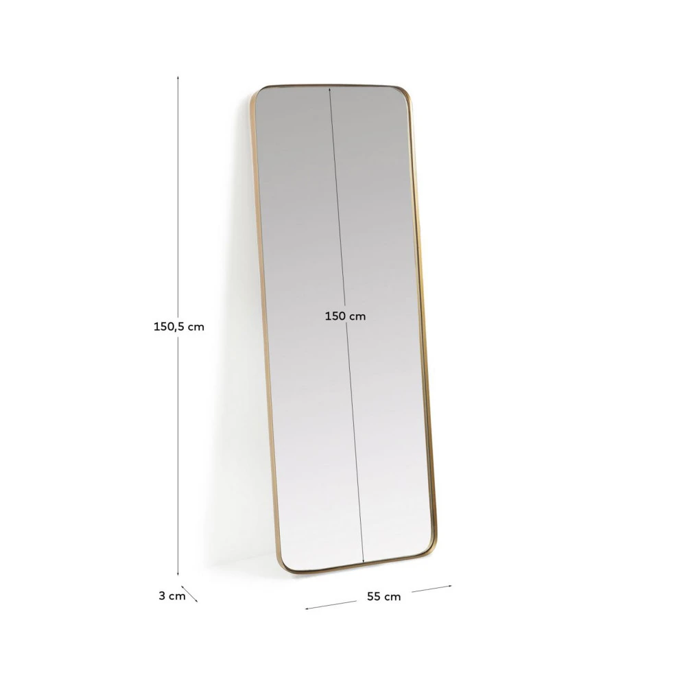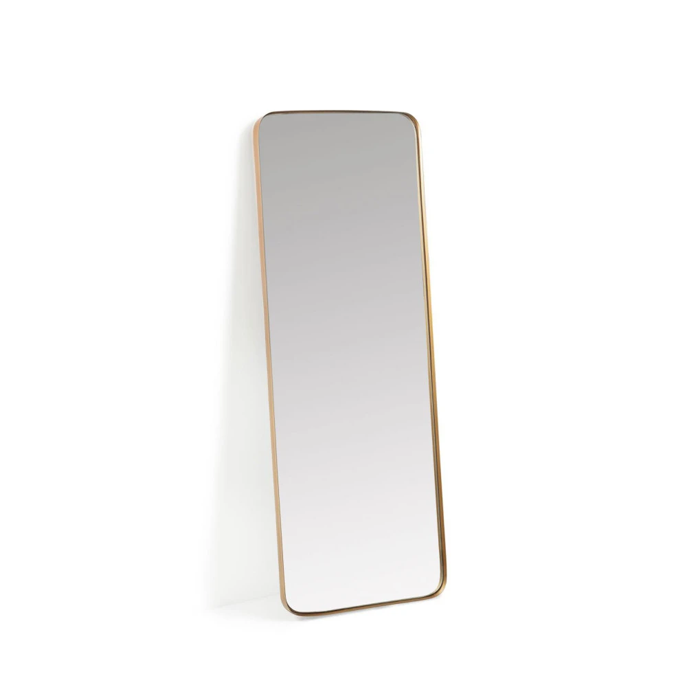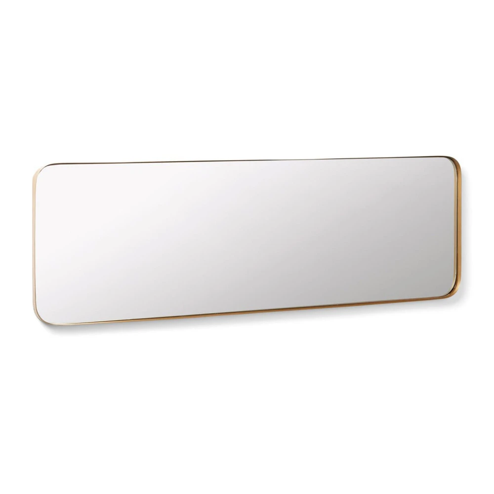Ce miroir de forme rectangulaire et soucieux de conserver l’atmosphère cocooning de votre pièce affiche des bords arrondis et un cadre en métal couleur laiton.