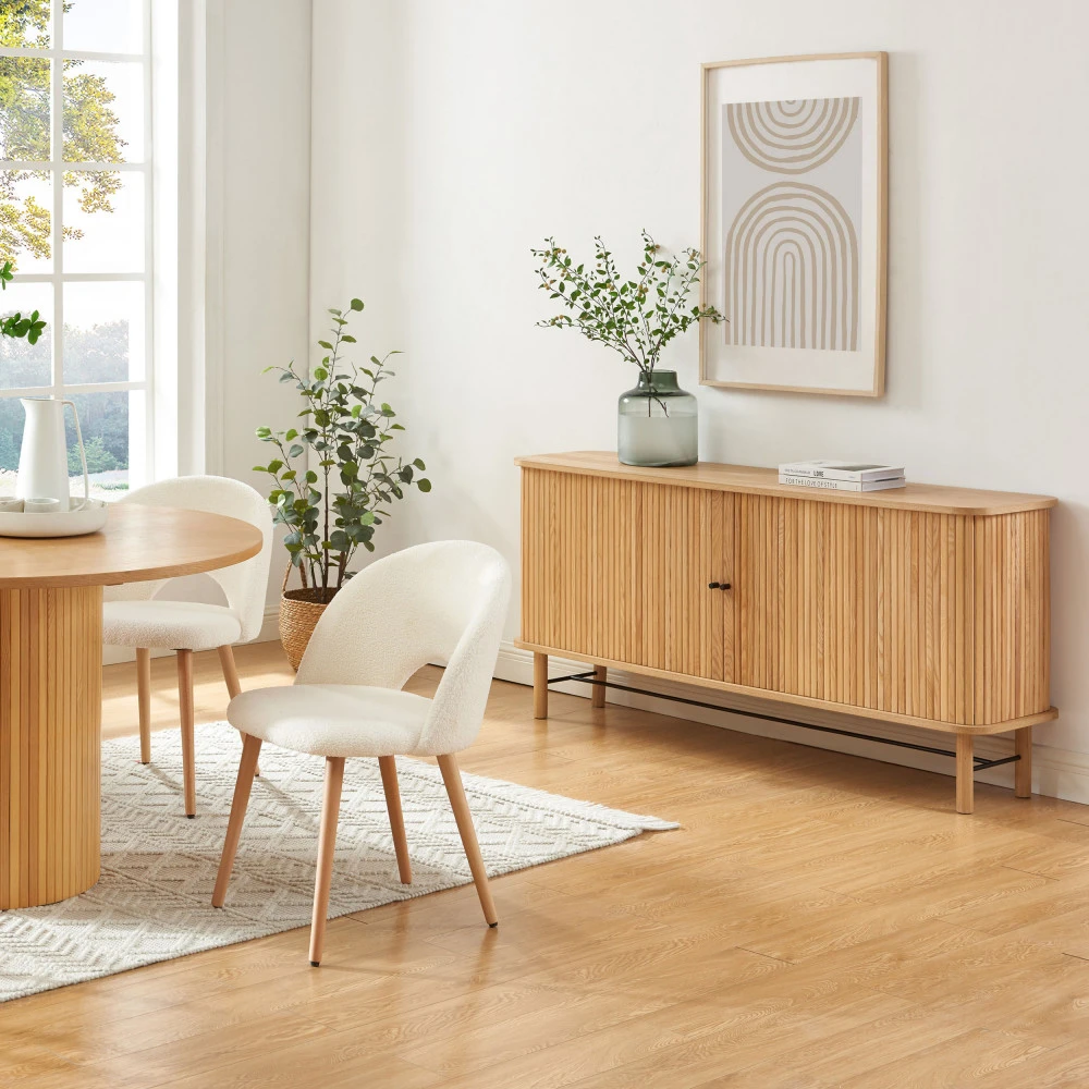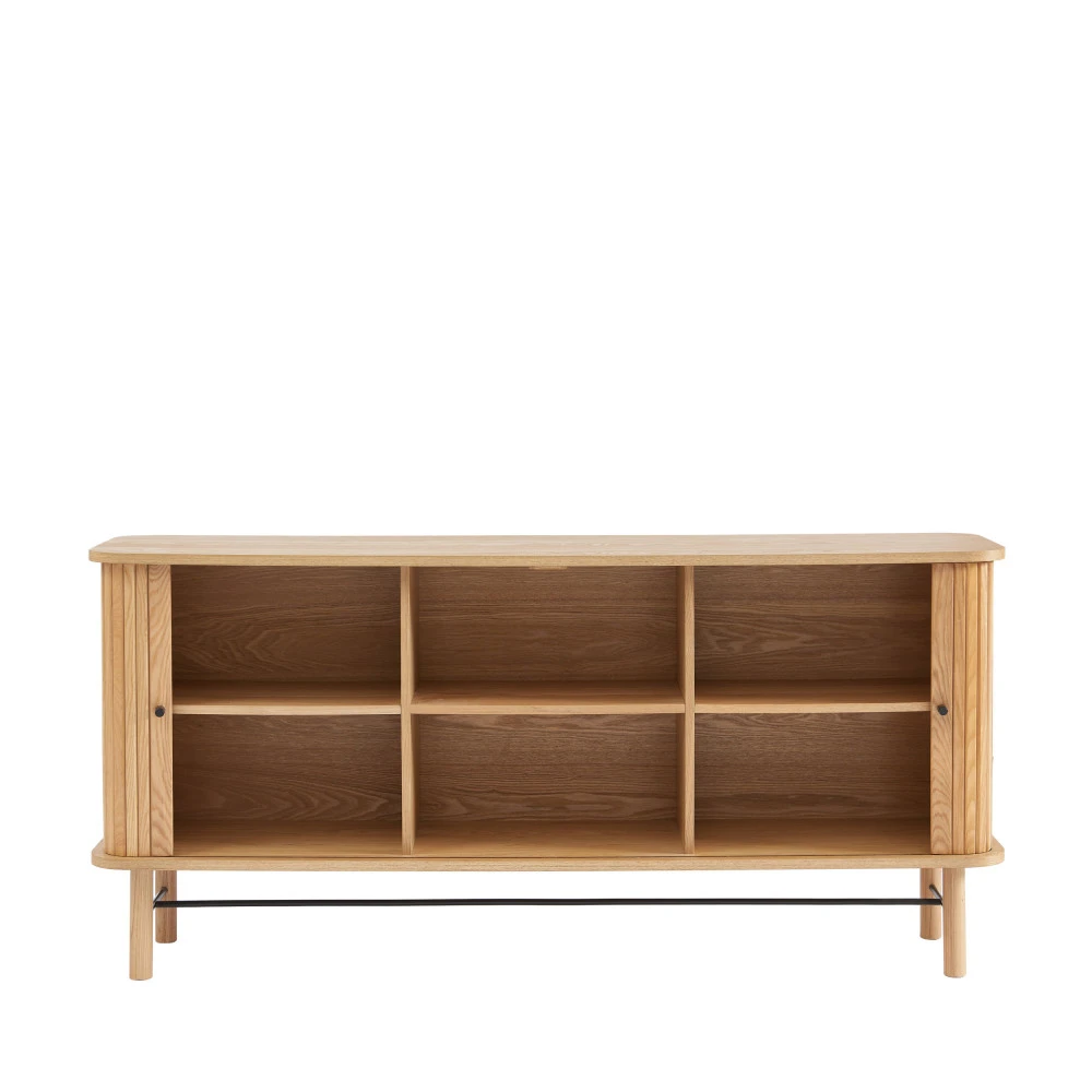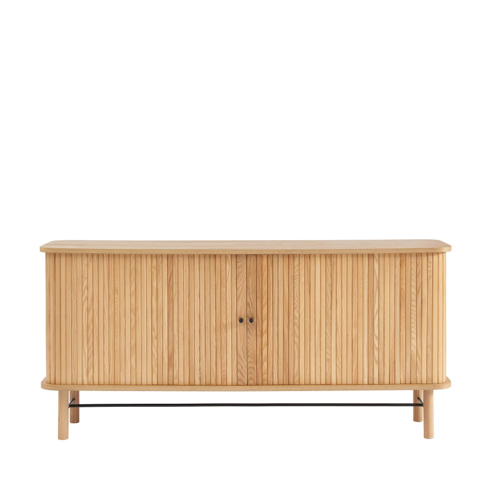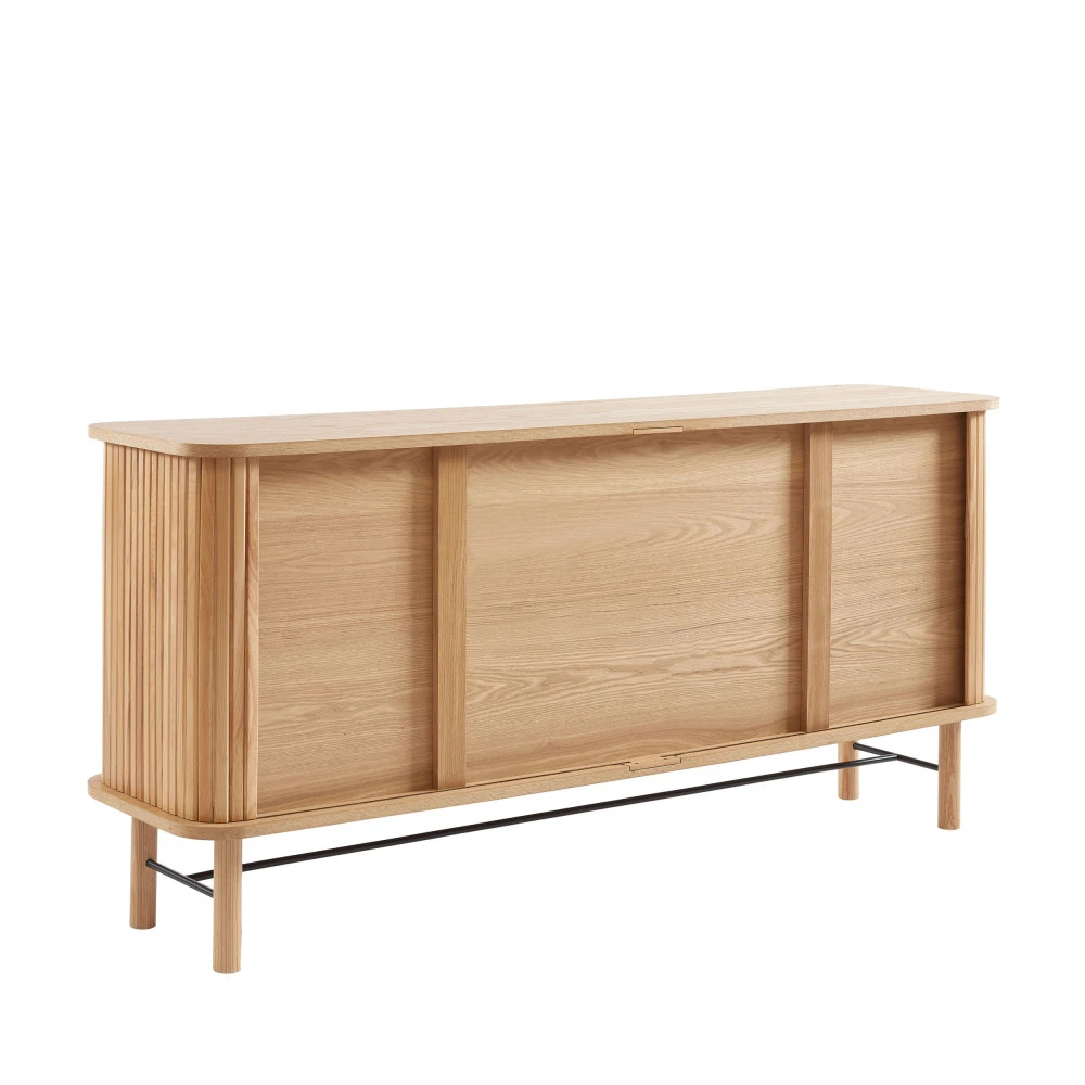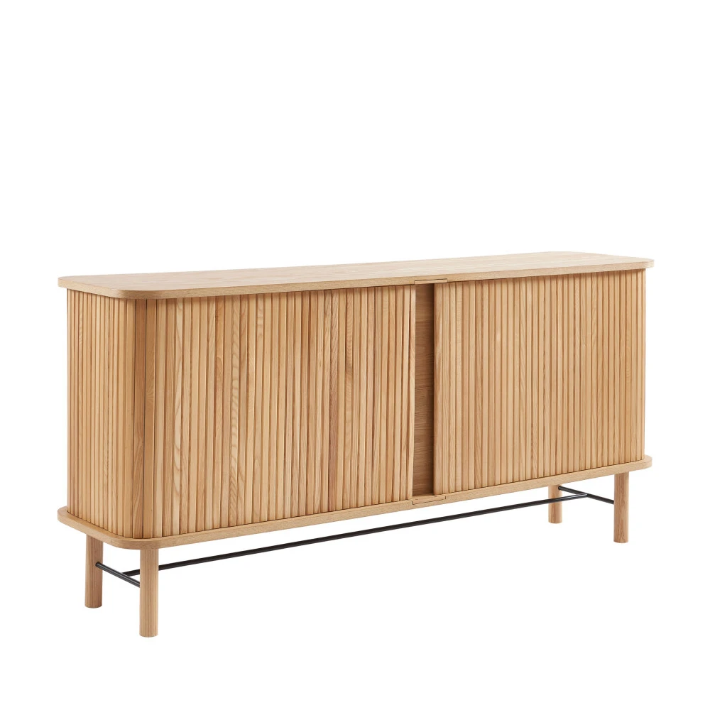 Ce buffet design se ferme par 2 élégantes portes coulissantes à lattes, avec de petits boutons de portes en métal assortis aux barreaux du piètement. Ce meuble est par ailleurs pourvu de 4 pieds cylindriques robustes en chêne massif de 20 cm de haut.