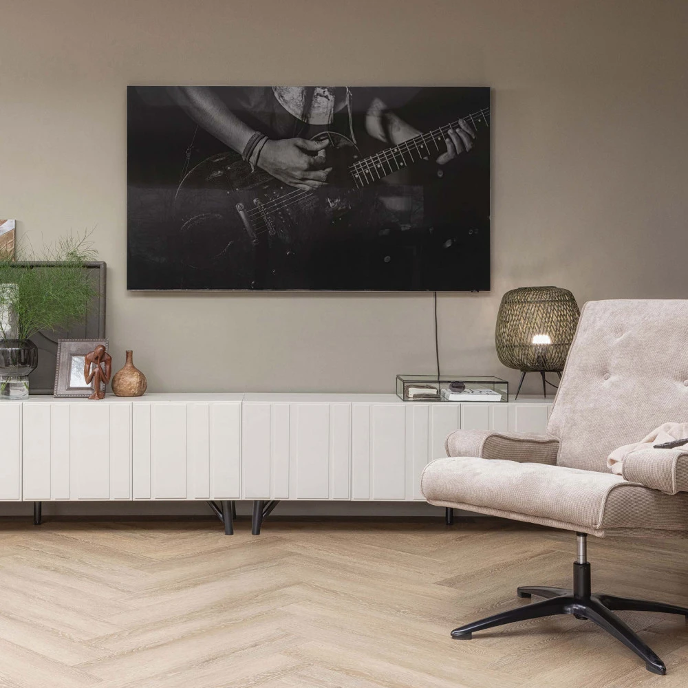 Le reste du plateau supérieur peut être utilisé à des fins purement décoratives. Une plante grasse, un vase, un bougeoir, quelques livres design, quels objets déco viendront tenir compagnie à votre poste de télé ?