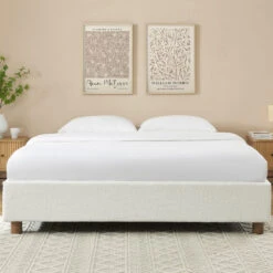 Le cadre du lit est recouvert d’un tissu bouclette au charme bohème, idéal pour installer une ambiance chaleureuse dans votre chambre à coucher. Sa teinte douce est aussi un atout de taille puisqu’elle apportera à votre pièce une grande luminosité et sera facile à accorder au reste de votre décoration.