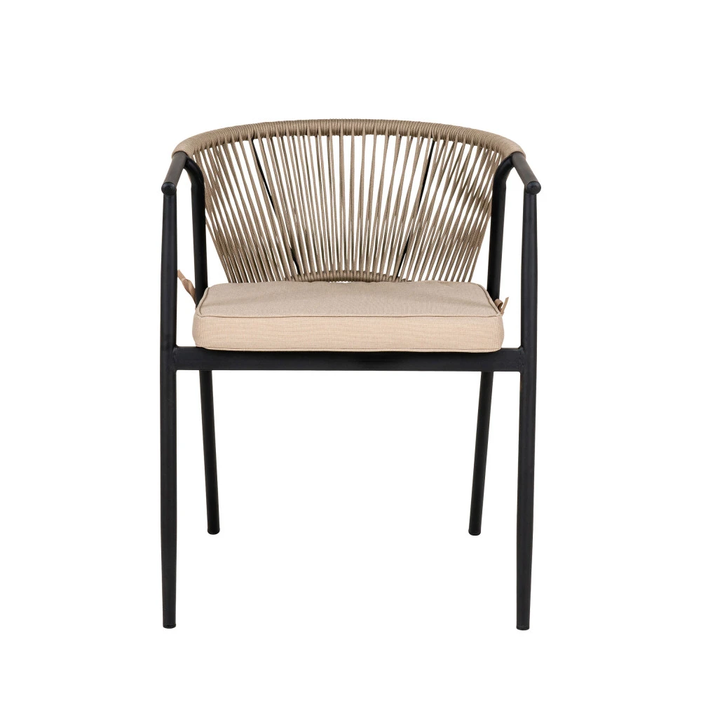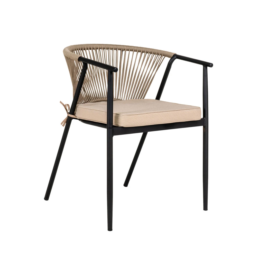 Ces chaises mesurent 76 x 63 x 58 cm. Elles se composent d’une structure en mĂ©tal avec accoudoirs intĂ©grĂ©s et de pieds obliques sur l’arrière, puis d’un dossier courbĂ© en corde. Elles sont accompagnĂ©es d’un coussin Ă©pais en polyester au look indĂ©modable, attachĂ© Ă l’arrière du siège par des rubans Ă nouer.