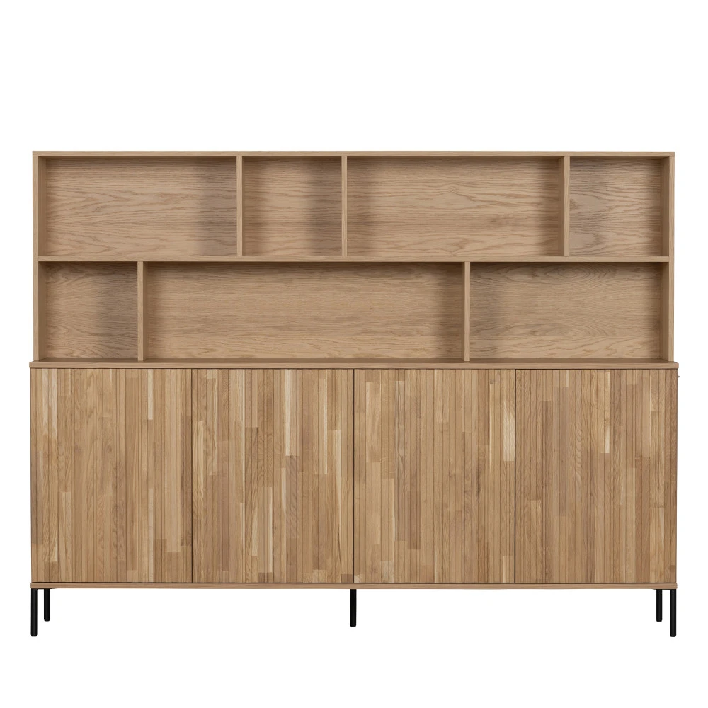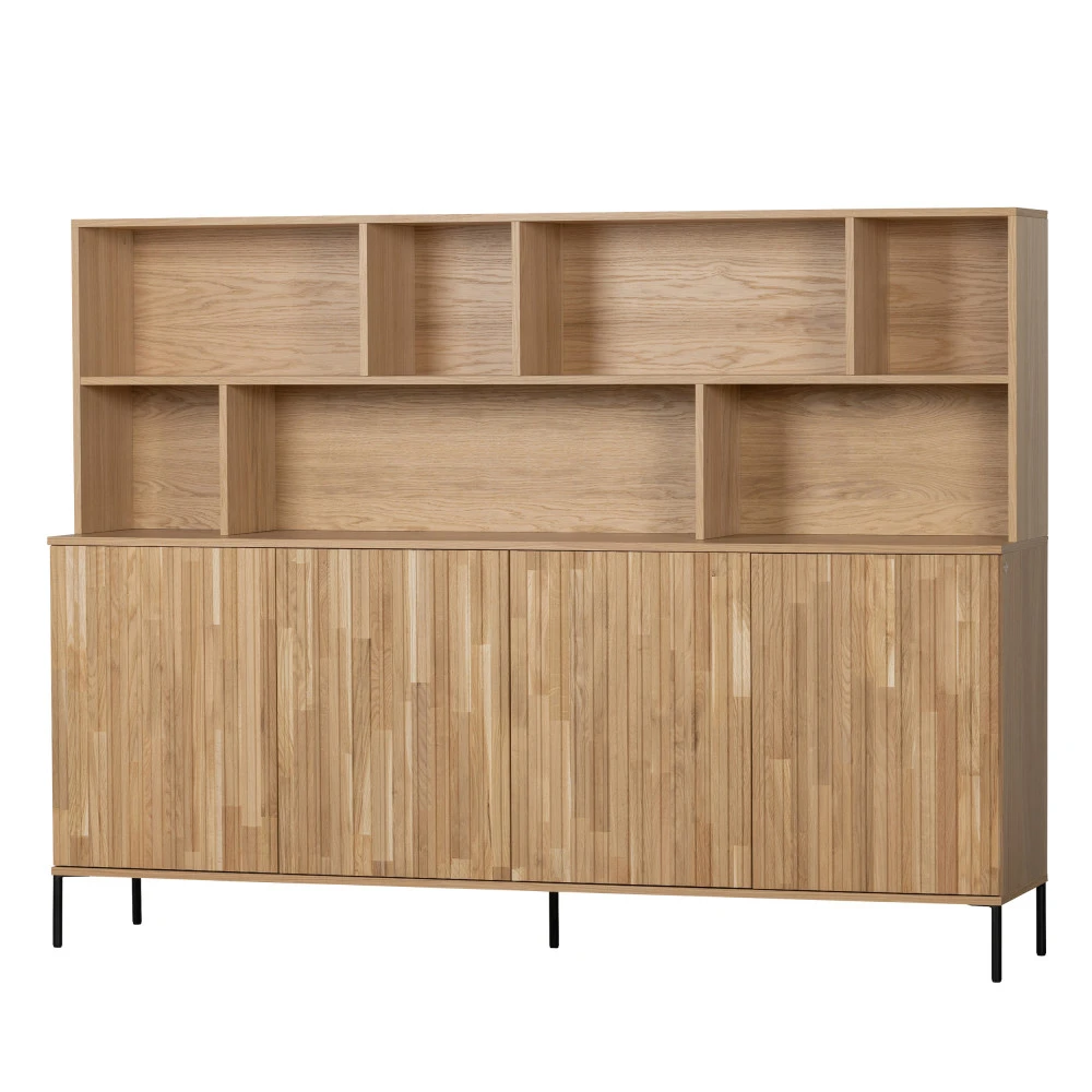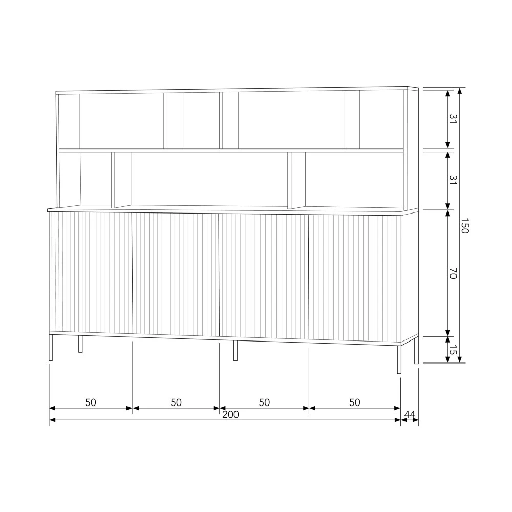 Ce buffet de style contemporain mesurant 150 x 200 x 40 cm est composé d’une partie ouverte sur le haut avec 7 niches de tailles différentes et d’une partie fermée en-dessous. La rangée supérieure comporte 4 compartiments, tandis que la rangée inférieure en compte 3, et les deux rangées font chacune 31 cm de hauteur. Les 4 portes à lattes sur le bas du meuble mesurent 66 x 50 x 2 cm et le meuble est pourvu de 4 étagères amovibles que vous pouvez installer à la hauteur voulue. Cela vous permet au final d’obtenir 8 compartiements de rangement intérieurs.