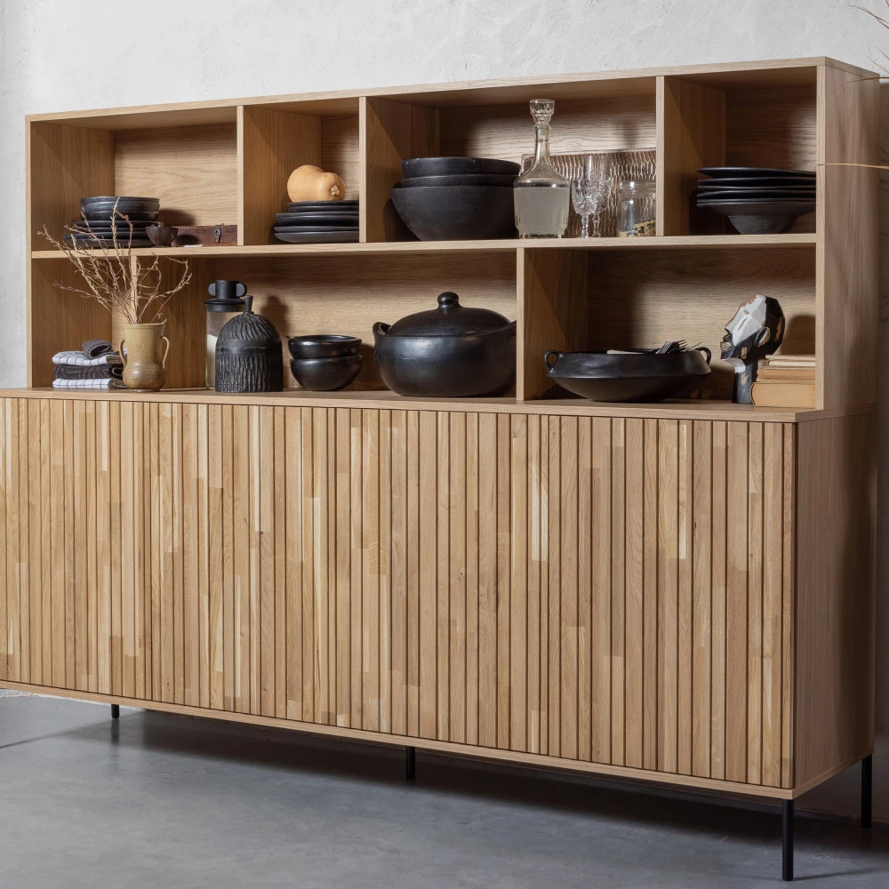 Ce grand meuble de rangement de 2 mètres de large pourra donc accueillir de nombreux objets ! Vous pourrez y ranger de la vaisselle, des vases ou tout autre élément de déco. Vous pouvez exposer en partie ouverte les plus beaux éléments et ranger derrière les portes inférieures le reste.