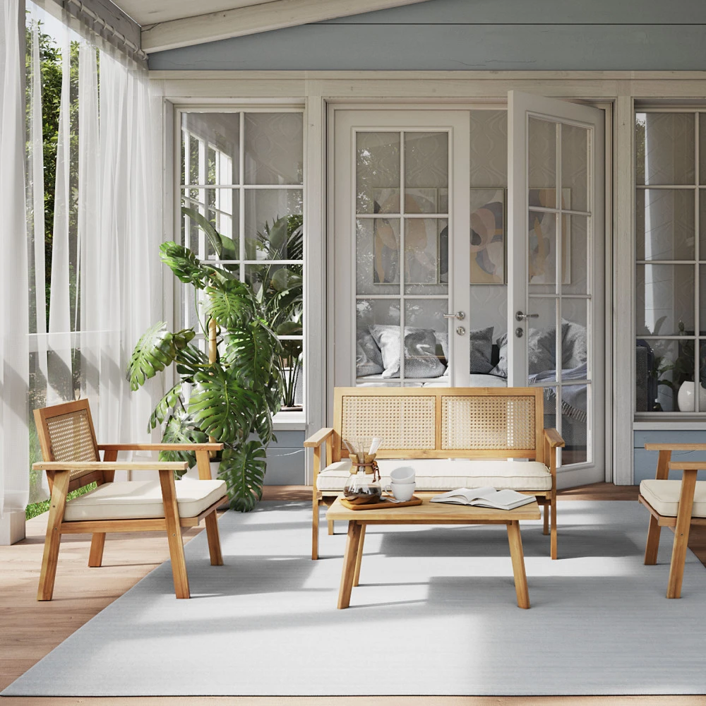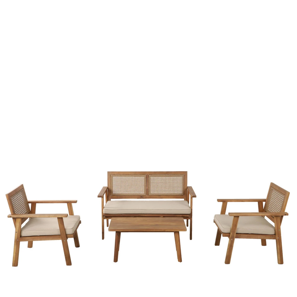 Le charme de ce salon de jardin tient en grande partie au mariage du bois massif d’acacia FSC et du cannage pour un rendu profondément bohème et naturel qui se mariera parfaitement avec la verdure de votre jardin. Les coussins positionnés sur les assises garantissent le confort des occupants grâce à leurs 5 cm d’épaisseur. Réalisés en tissu polyester déperlant et entièrement déhoussables, ils sont également faciles à entretenir.