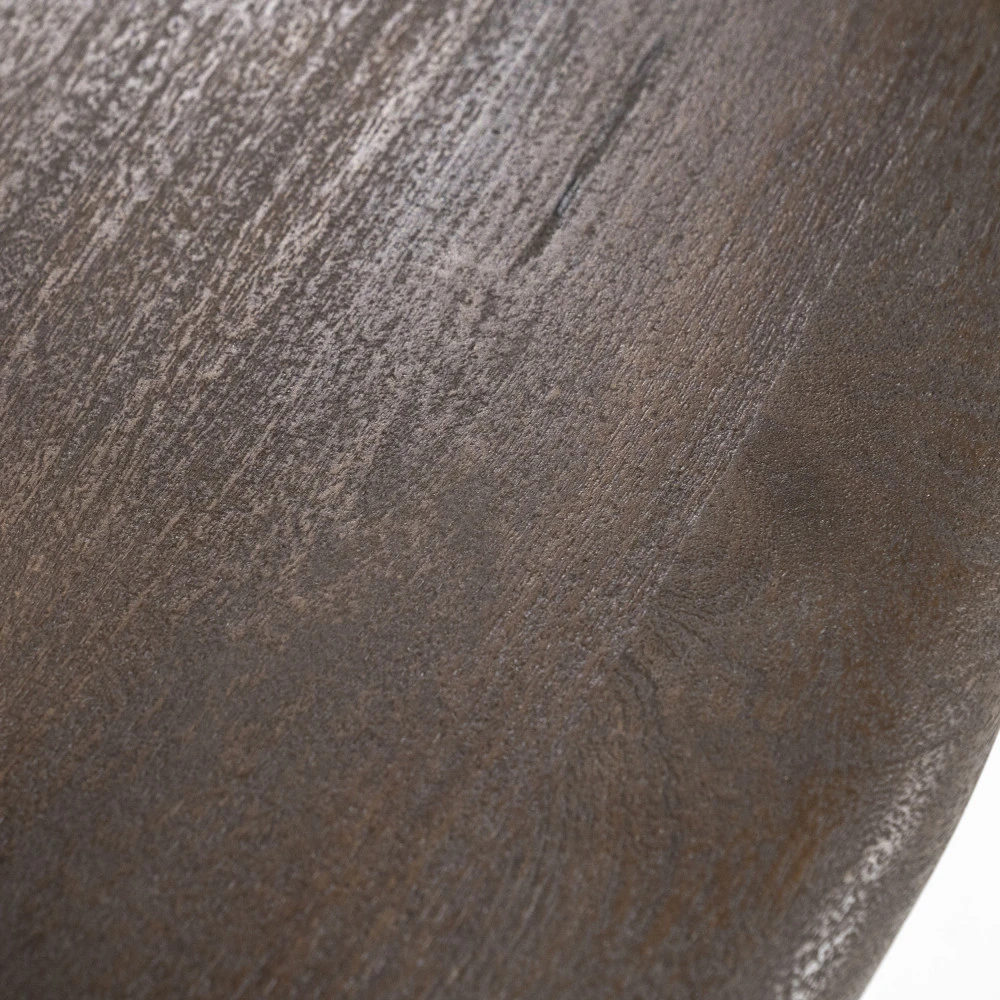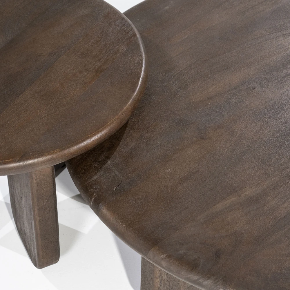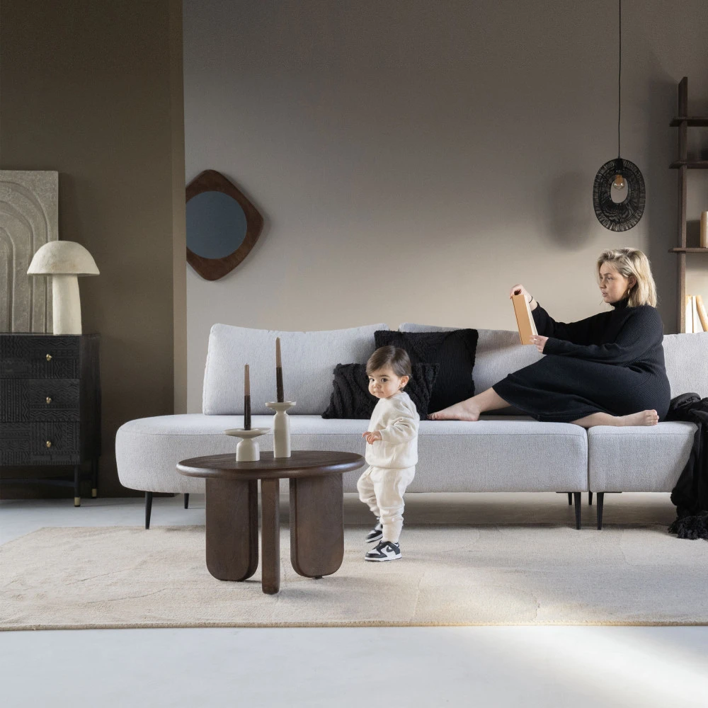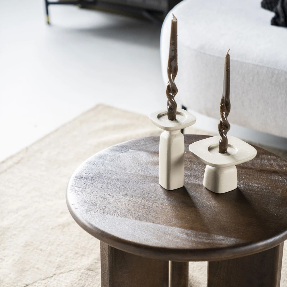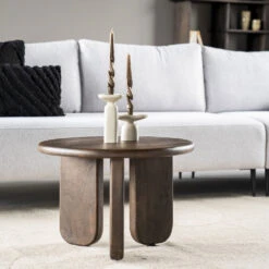 Cette table basse est faite de bois massif (manguier) aux belles veinures naturelles, et affiche un design robuste sans être imposant. Elle se compose d’un plateau d’épaisseur moyenne à la forme ronde classique, soutenu par 3 pieds larges. Ces derniers affichent une forme originale, comme des panneaux à bords arrondis avec patins. Ce piètement fait tout le charme du modèle. On aime ce look à la fois vintage et contemporain. Et vous ?