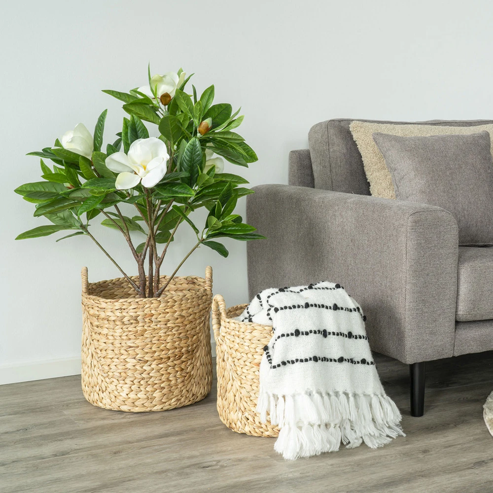 Ce lot se compose de 2 paniers confectionnés en jacinthe d’eau, une fibre naturelle. Il s’agit d’une plante aquatique originaire d’Amérique du sud, qui offre de jolies nuances sur ces paniers tressés.