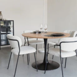 Autre avantage : une table ronde aura tendance à paraitre moins massive, et donc à allonger visuellement une pièce, ce qui peut se révéler pratique dans une cuisine exiguë. Pour lui apporter un peu de peps, vous pouvez l’accessoiriser avec des chaises chinées, des sets de table colorés, de la vaisselle à motif. N’ayez pas peur du dépareillé, c’est plus tendance que jamais ! Vous pouvez aussi choisir de la déposer sur un grand tapis berbère, graphique ou ethnique afin de varier les styles.
